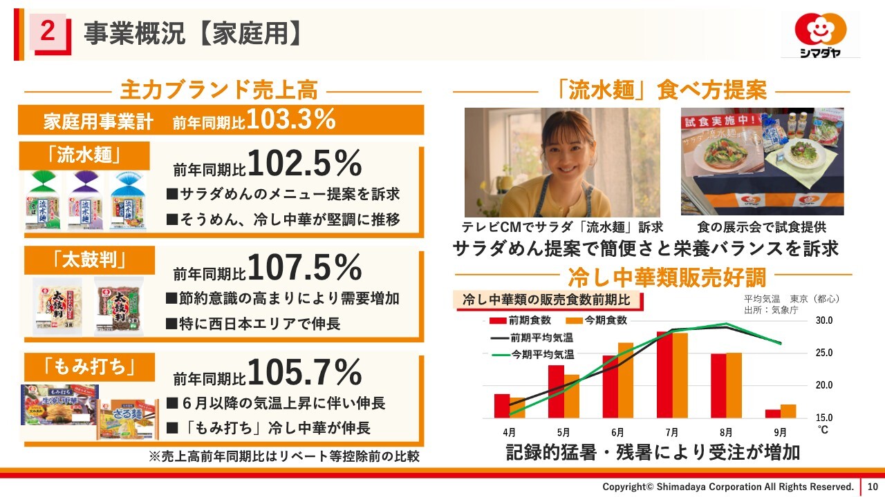 「流水麺」ブランドは、商品パッケージやテレビCMを通じて、簡便さと栄養バランスを訴求したサラダめんメニューの提案を積極的に実施しました。「太鼓判」ブランドは節約志向の高まりにより需要が増加し、特に西日本エリアにおいて伸長しました。