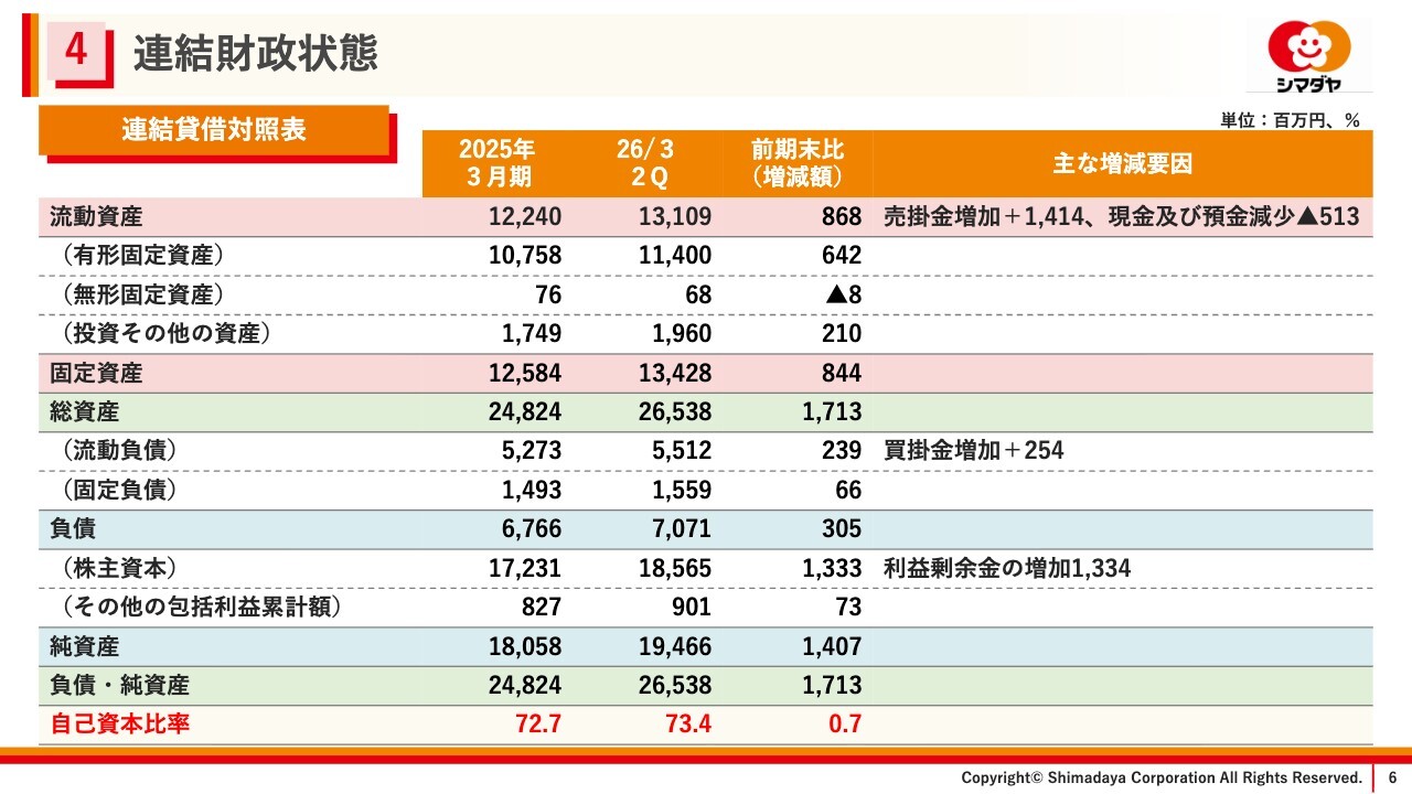 当中間期末の総資産は265億3,800万円となり、前年度末に比べ、17億1,300万円増加しました。これは、売掛金増加による流動資産の増加8億6,800万円、有形固定資産増加による固定資産の増加8億4,400万円が主な要因となっています。