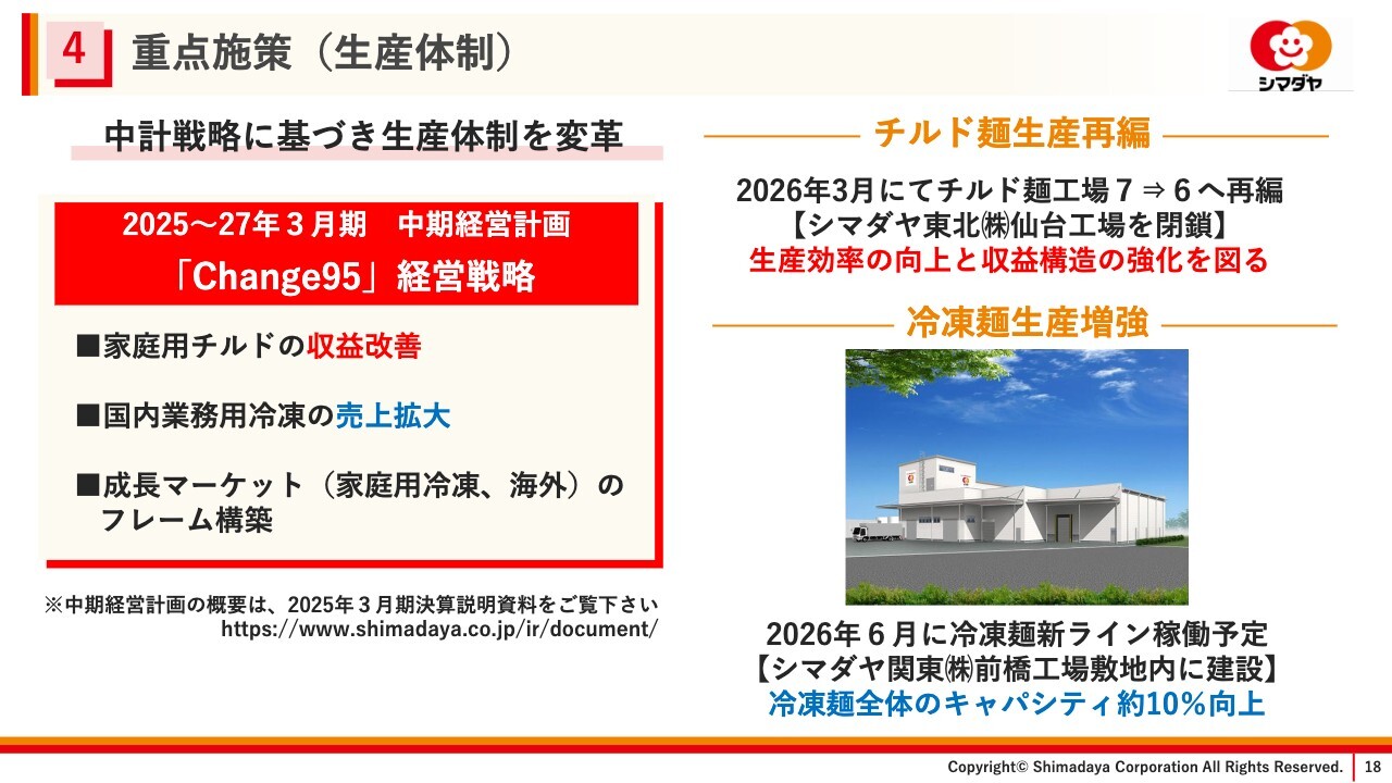 一方で、冷凍麺生産体制については、国内業務用冷凍の売上拡大および、成長マーケットの今後の売上拡大に向け生産キャパシティを増強するため、新ラインを建設しています。こちらは、シマダヤ関東前橋工場の敷地内に建設し、2026年6月に稼働予定です。当ラインが稼働することにより、冷凍麺全体のキャパシティが約10パーセント向上します。