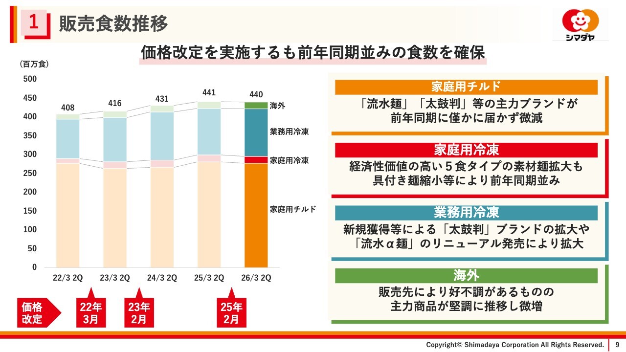 こちらは販売食数の推移です。価格改定の影響による販売食数の減少も懸念していましたが、全体としては、前年同期並みの食数を確保しました。