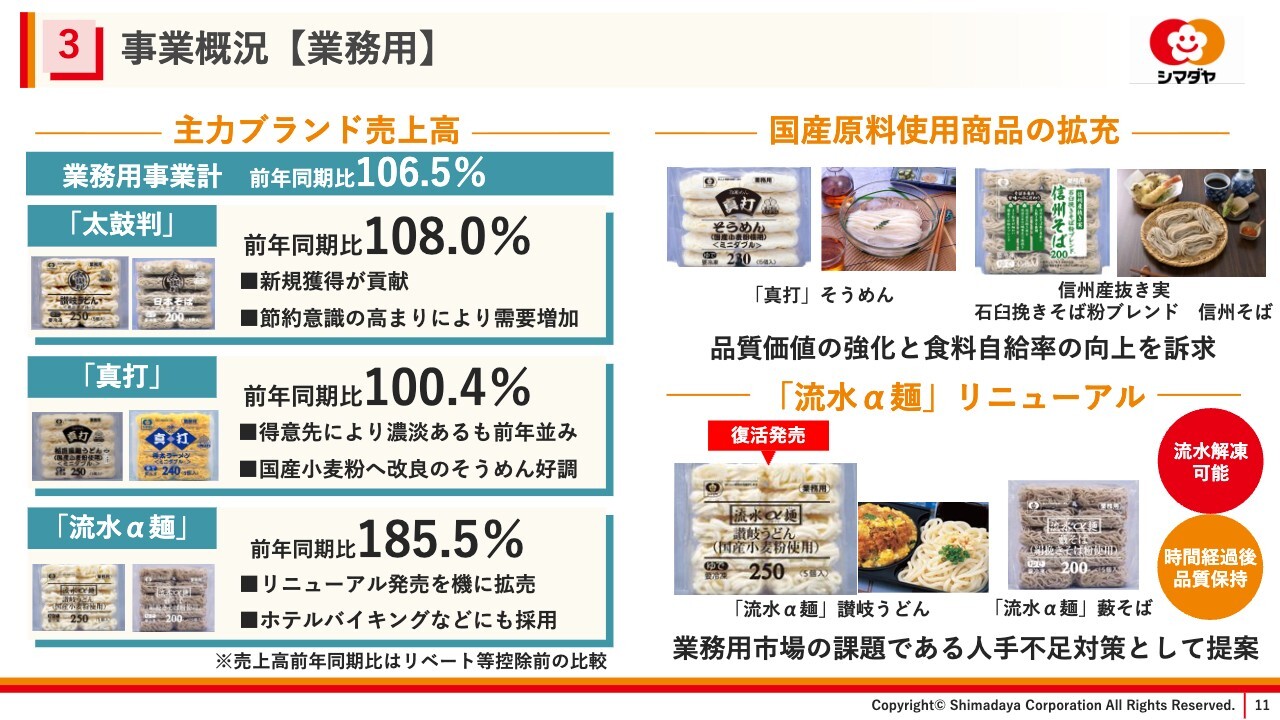 一方、業務用冷凍は、新規獲得等による「太鼓判」ブランドの拡大や、「流水α麺」のリニューアル発売により拡大しました。