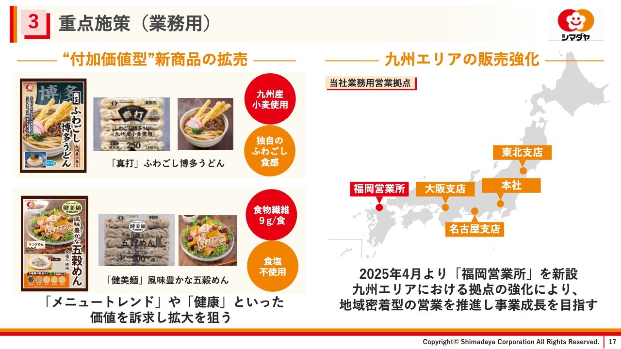 この下期より、「真打」ブランドにて、メニュートレンドである博多うどんを、「健美麺」ブランドにて、食塩不使用で食物繊維を1食9グラム含んだ五穀めんを発売しています。既存の付加価値商品とともにお客さまの課題解決に向け提案していきます。