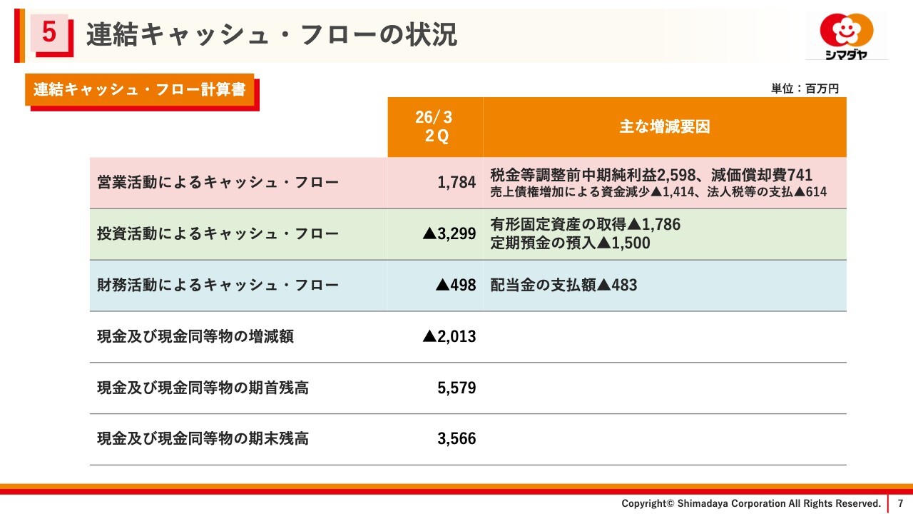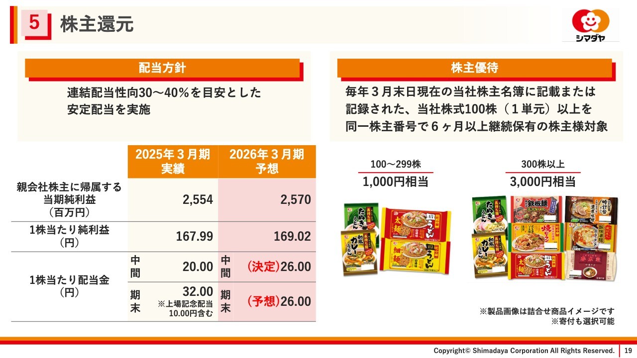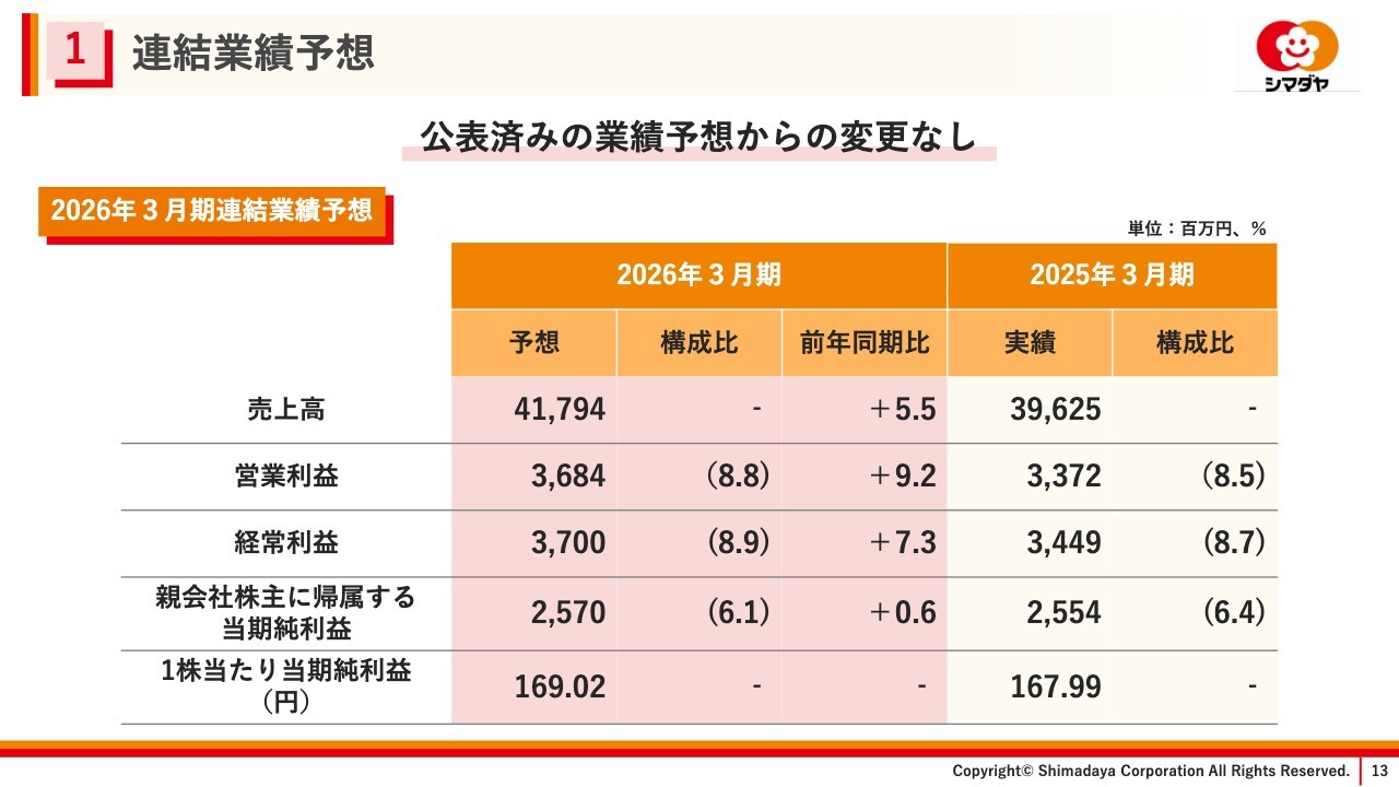 連結業績予想については、冒頭でご説明した、シマダヤ東北仙台工場の閉鎖に伴う減損損失を織り込んだ上でも、2025年5月12日に公表した予想から変更はありません。引き続き、付加価値商品の拡売および生産性の向上、コスト合理化に取り組み、計画達成に向け各種施策に取り組んでいきます。
