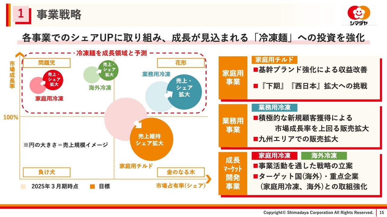 事業戦略についてまとめると、すべての事業でシェアアップを図りながら、成長領域と予測する業務用冷凍に加え、家庭用冷凍、海外冷凍の「冷凍麺事業」を次なる成長エンジンと位置づけ、生産・物流体制の再構築、人材育成、ブランド力強化を通じて、持続的な企業価値の向上を目指していきます。