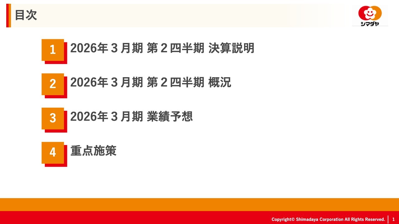 岡田賢二氏:みなさま、こんにちは。シマダヤ株式会社代表取締役社長執行役員の岡田です。この度は、当社2026年3月期第2四半期決算説明をご覧いただき、誠にありがとうございます。