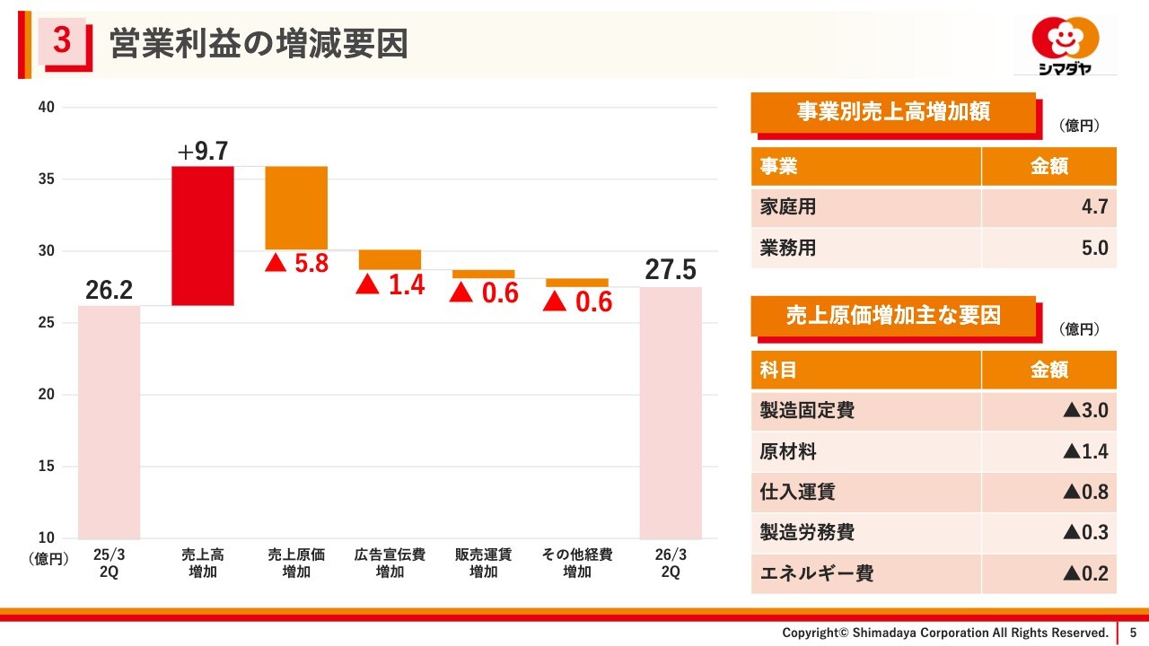 次に、営業利益の増減要因です。商品価格改定の影響が大きく、売上高は9億7,000万円増加しました。