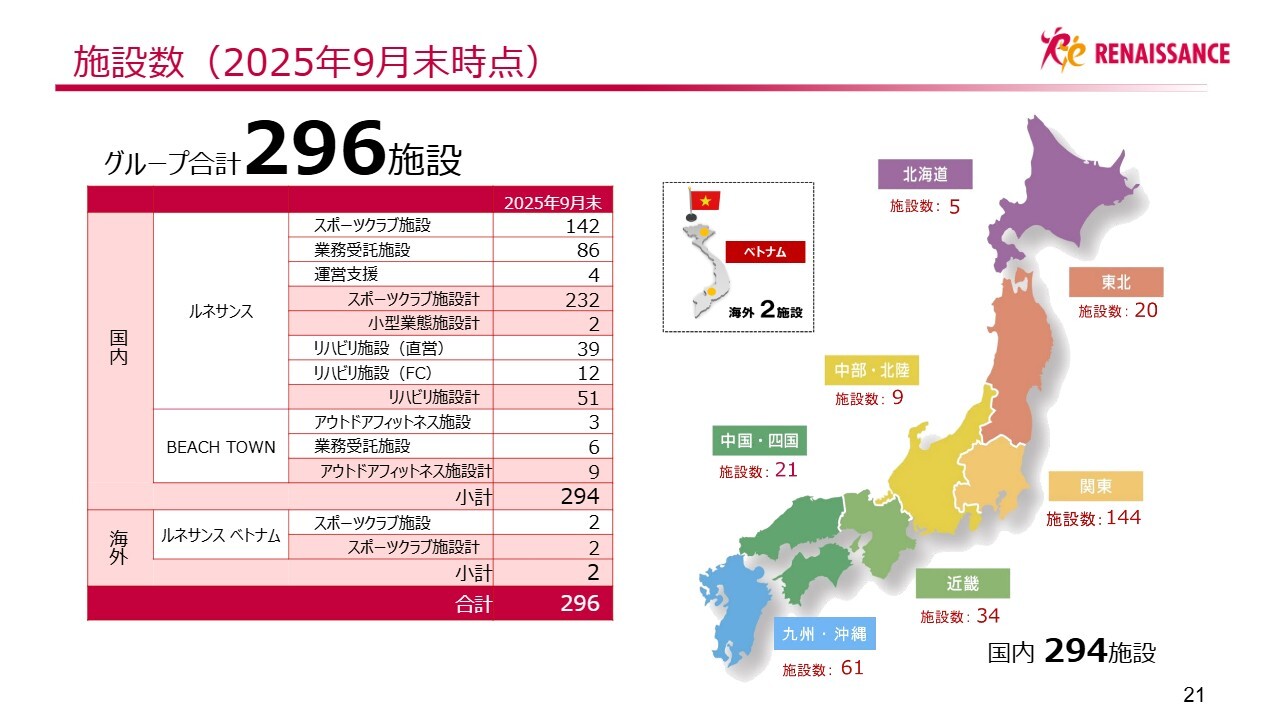 グループ全体の国内施設数は、9月末時点でBEACH TOWN社を含め294施設となりました。