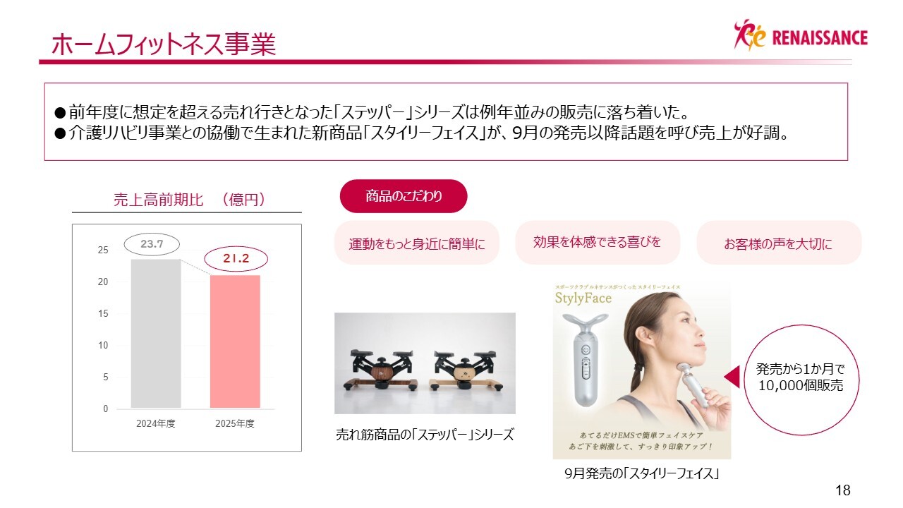 ホームフィットネス事業では、今年度、ルネサンスへブランド変更後、主力商品「ステッパー」のAmazonレビューが引き継がれず、イチからのスタートとなったことなどが影響し、売上は前年を下回る結果となりました。