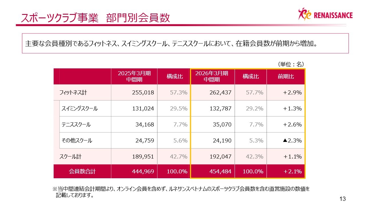 もう1つの要因として、スイミングスクールもおかげさまで順調に伸びており、テニススクールも前年から増加していることが挙げられます。これら主要な会員種別である3種目において、フィットネスでは入会が好調で、スクールでは入会と退会がいずれも堅調に推移しており、全体の在籍会員数が伸びている状況です。