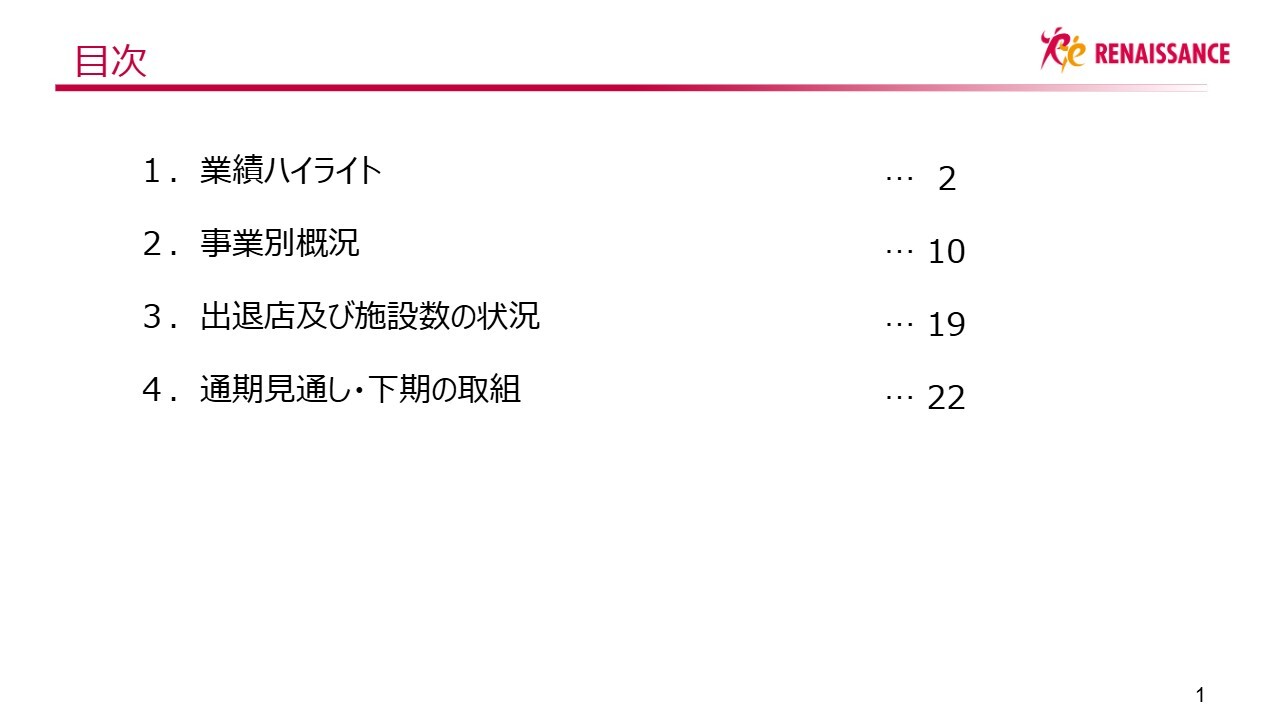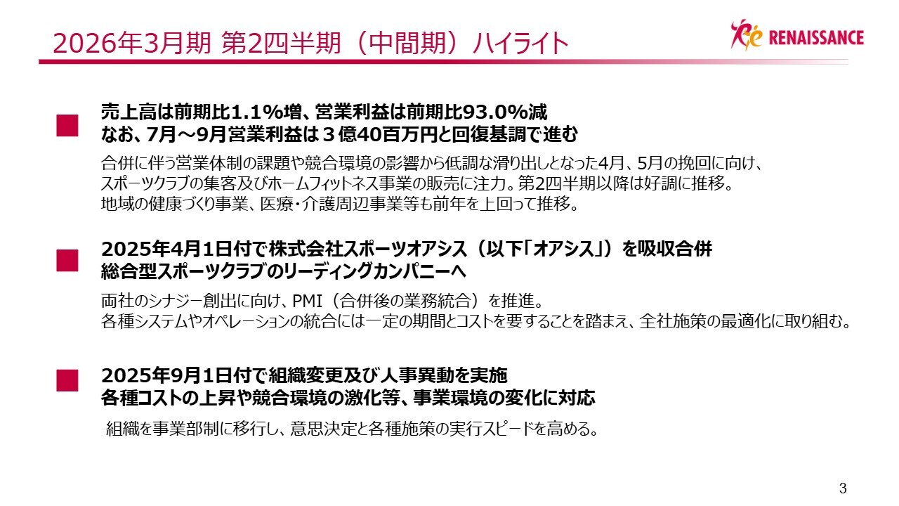 業績ハイライトです。当中間連結会計期間の連結業績では、第1四半期にスポーツクラブの入会が予想よりも低調だったことなどにより、売上高や各段階利益に影響が出ました。しかし、第2四半期以降は持ち直し、回復基調にあります。