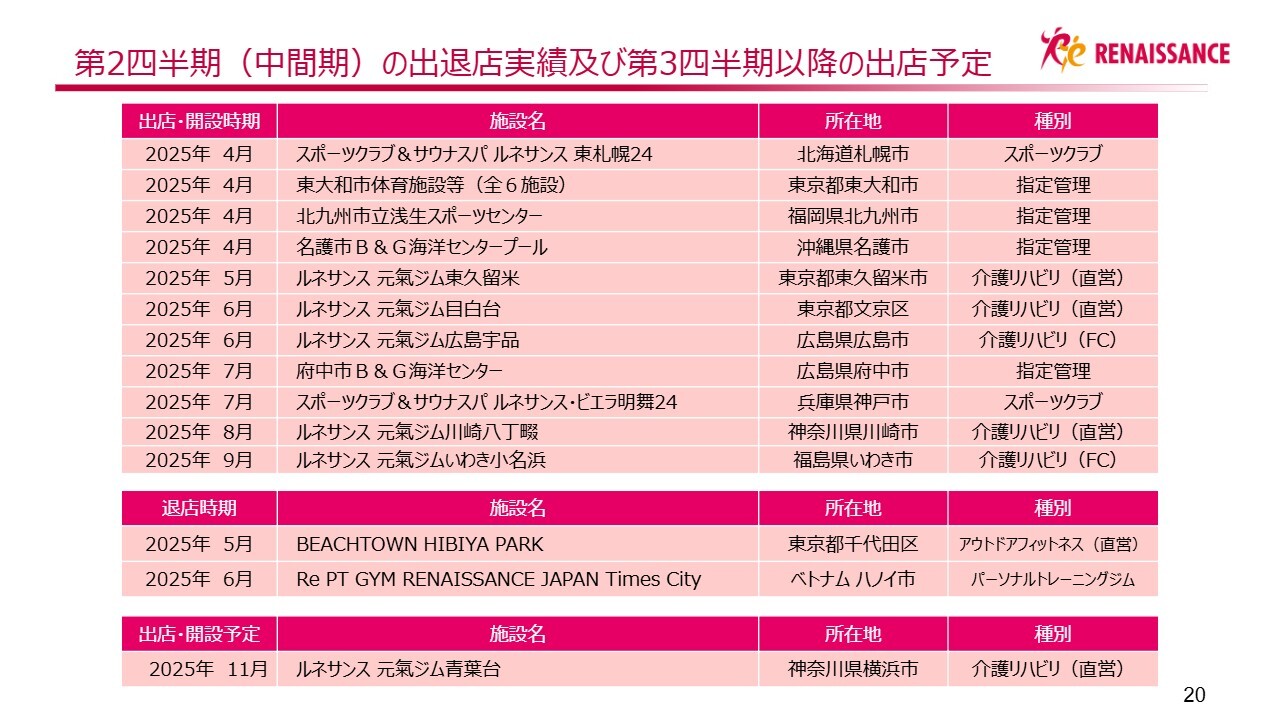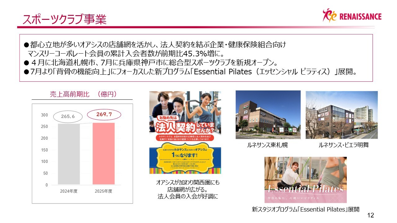 また、当中間連結会計期間中に、札幌市と神戸市に総合型スポーツクラブ2施設を開業しました。両施設は他社が撤退した店舗をリニューアルすることで、コストを抑えた新規出店が実現しています。
