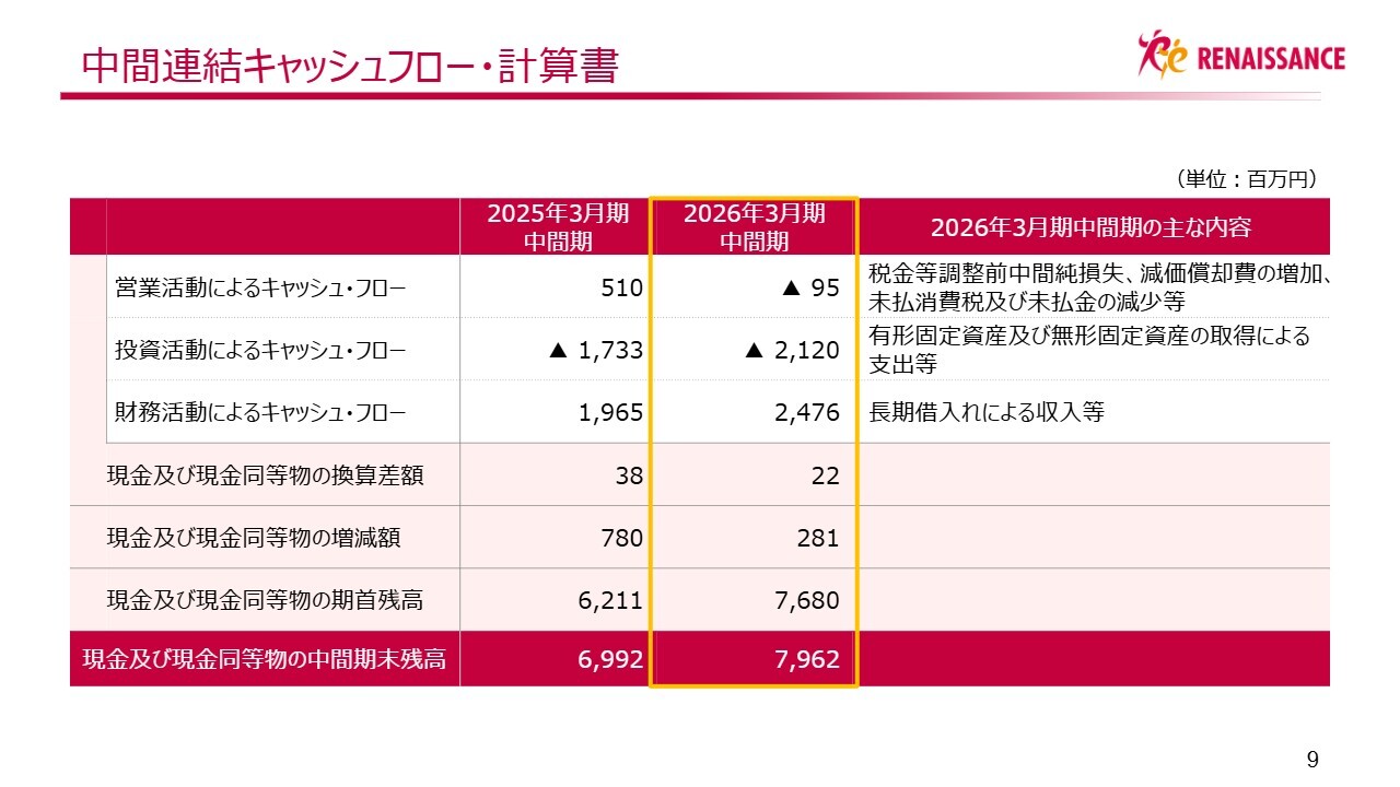 スポーツクラブの入会は6月以降、非常に好調に推移しており、ホームフィットネス事業についても下期以降に改善の兆しが見られます。また、人件費のコスト管理についても引き続き取り組んでいきますので、下期以降にご期待いただければと思います。