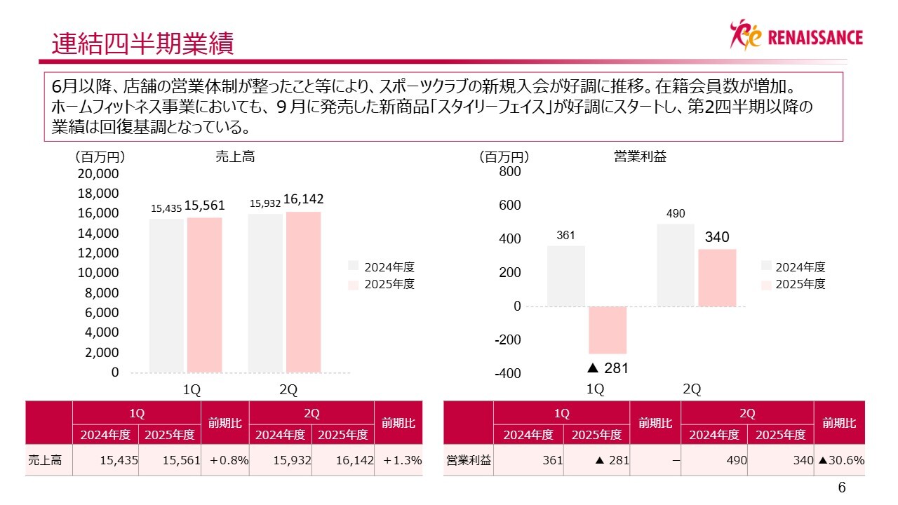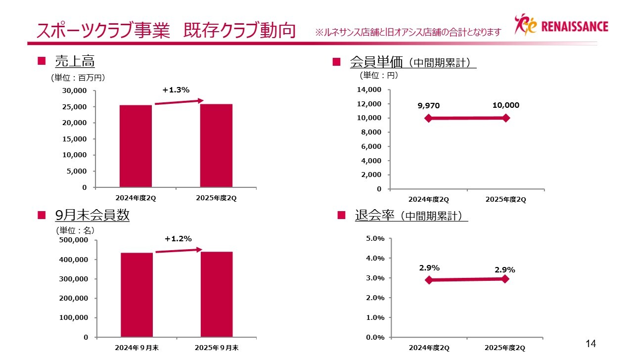 6月以降、新規入会者数が前年を上回りました。今期に開業した新店2店舗を除く既存店舗の9月末の会員数は、前年同期比1.2パーセント増となっています。在籍会員数の増加に伴い、売上高も前年同期比1.3パーセント増となりました。
