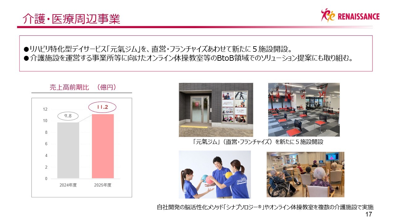 また、自社開発の脳活性化メソッド「シナプソロジー」を活用したオンライン体操教室を、認知機能低下の予防に効果が見込まれるとして介護施設などへ販売するなど、BtoB領域への事業拡大にも取り組んでいます。