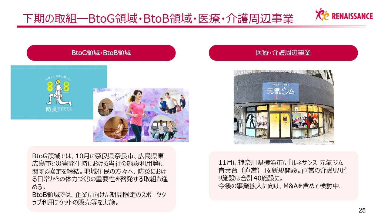 すでに開始している第3四半期では、スポーツクラブ事業やホームフィットネス事業の順調な回復を踏まえ、医療・介護周辺事業及び企業・自治体向け事業の展開を加速します。