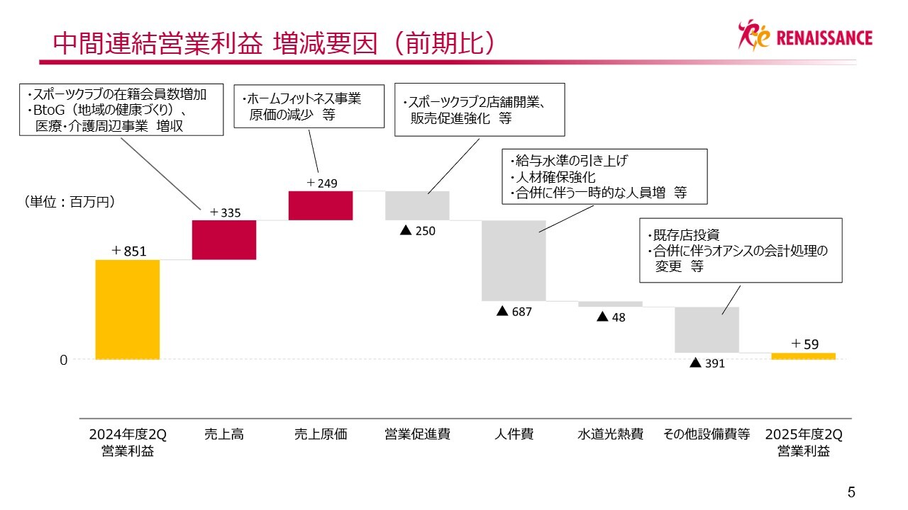 スライドのグラフは、前年同期からの営業利益の増減要因を示しています。まず、売上高についてですが、スポーツクラブ事業の会員数が前年から増加したことに加え、BtoG(地域の健康作り)事業や「元氣ジム」などの医療・介護周辺事業が前年から増収となり、3億3,500万円増加しました。