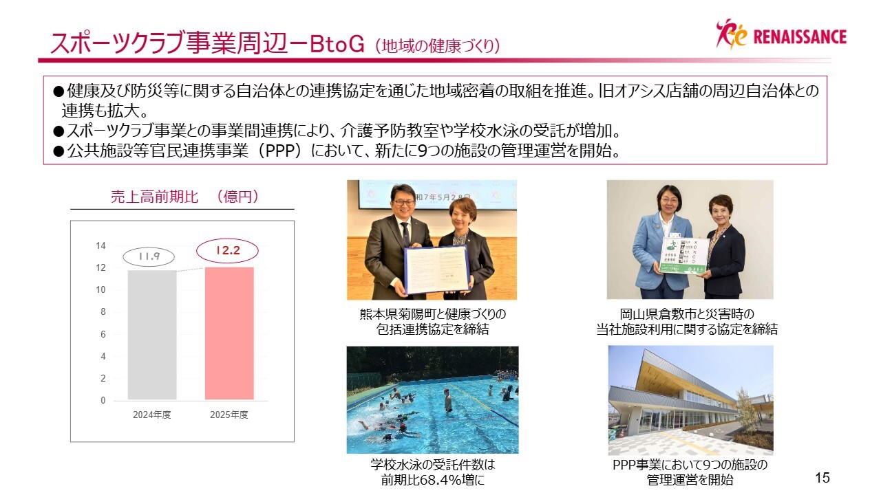 BtoG(地域の健康作り)事業では、昨年に引き続き、災害時の地域支援の体制作りや、介護予防教室、学校水泳授業の受託など、地域の課題解決に向けた取り組みを拡大しています。