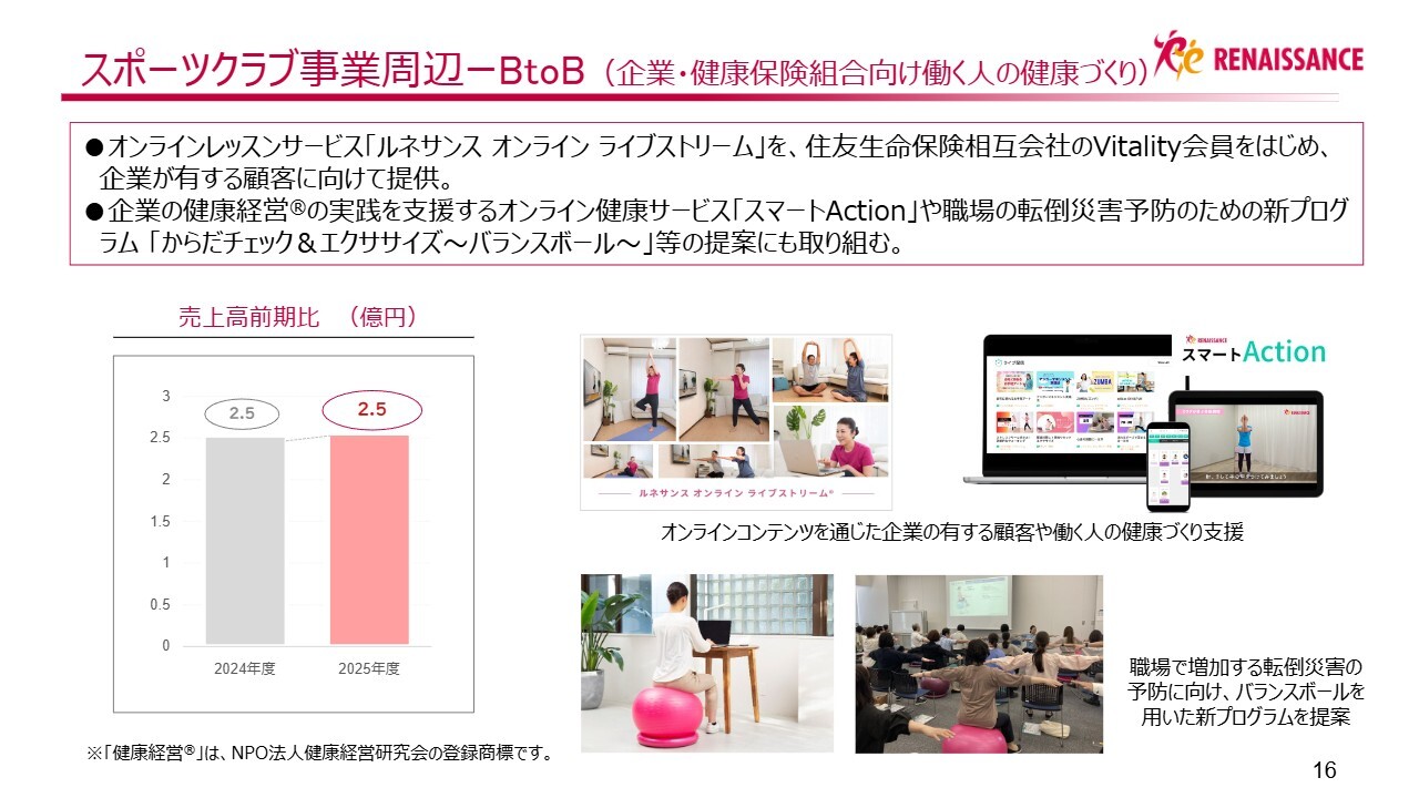 BtoB(企業・健康保険組合向け働く人の健康作り)事業では、企業の健康経営を支援するオンライン配信サービス「スマートAction」を提案しました。また、顧客を有する企業に対しては、顧客の付加価値を高めるために「RENAISSANCE Online Livestream」などのオンラインレッスンサービスの提供にも取り組みました。