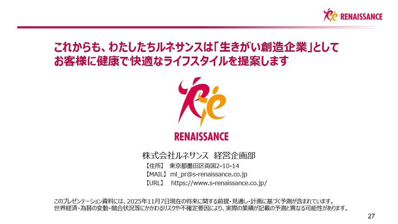 最後に、オアシスとのPMIについてです。今後、各種システムを段階的に統合し、バックオフィス業務の効率化を推進するとともに、スポーツクラブ事業におけるマネジメント体制を一部変更し、両社の強みを活かしてシナジー効果を迅速に創出できるよう取り組んでいきます。