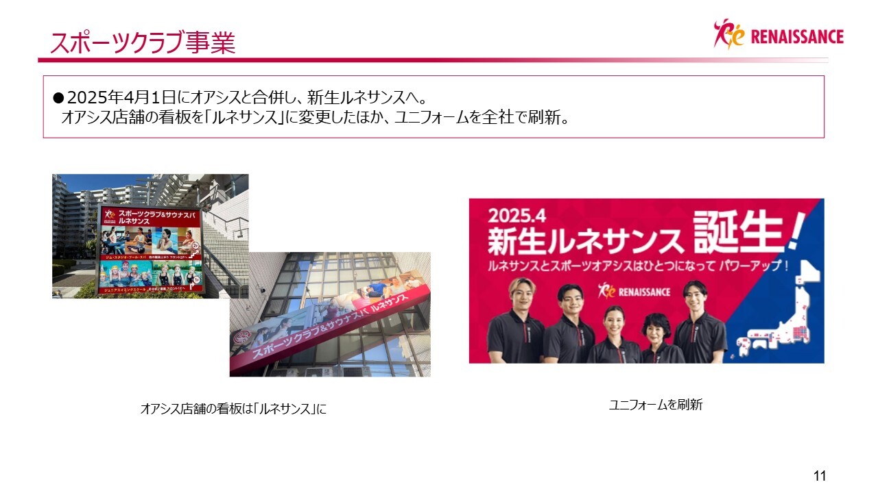 スポーツクラブ事業では、オアシスの看板を「スポーツクラブ&サウナスパ ルネサンス」に掛け替えたほか、4月から全社的に店舗スタッフのユニフォームを刷新しました。