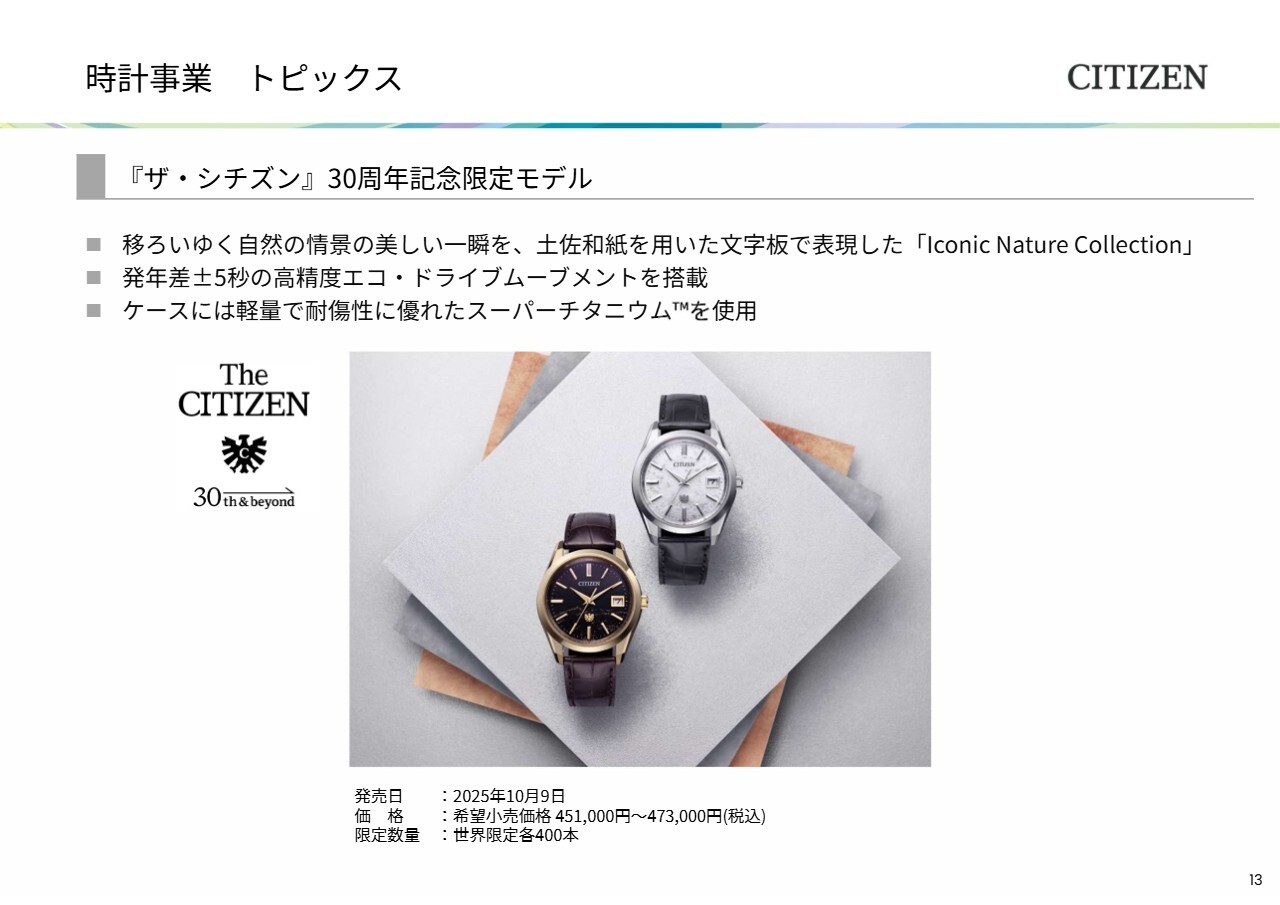 時計事業のトピックスです。まず「ザ・シチズン」です。1995年に「人生に寄り添う時計」として誕生した「ザ・シチズン」は、2025年に30周年を迎えました。