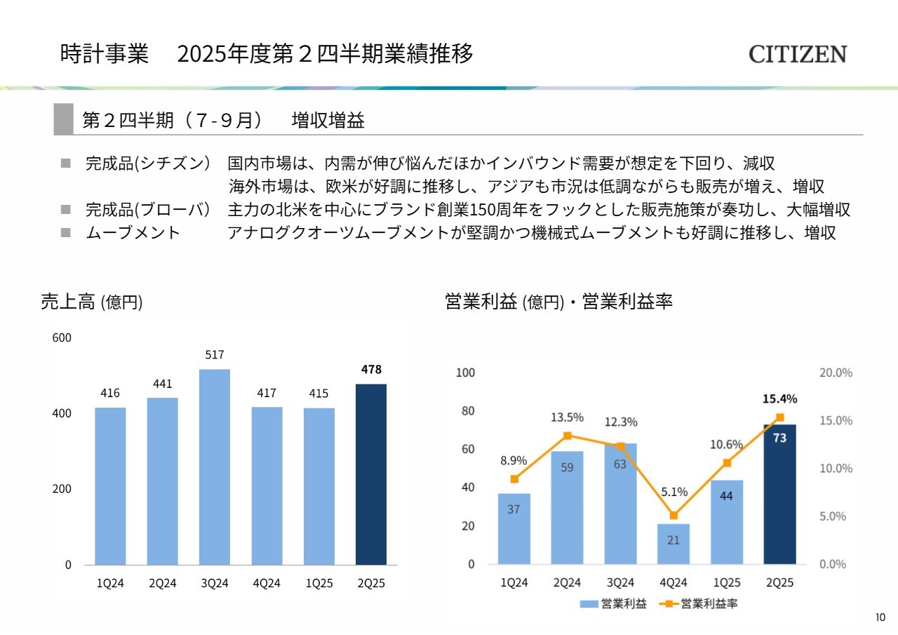 事業セグメント別の業績についてです。時計事業の売上高は478億円で、前年同期比8.4パーセントの増収、営業利益は73億円、前年同期比24パーセントの増益、営業利益率は15.4パーセントとなりました。