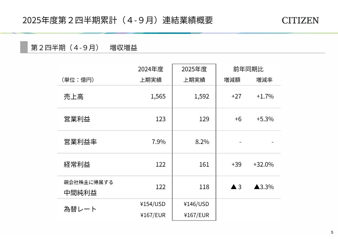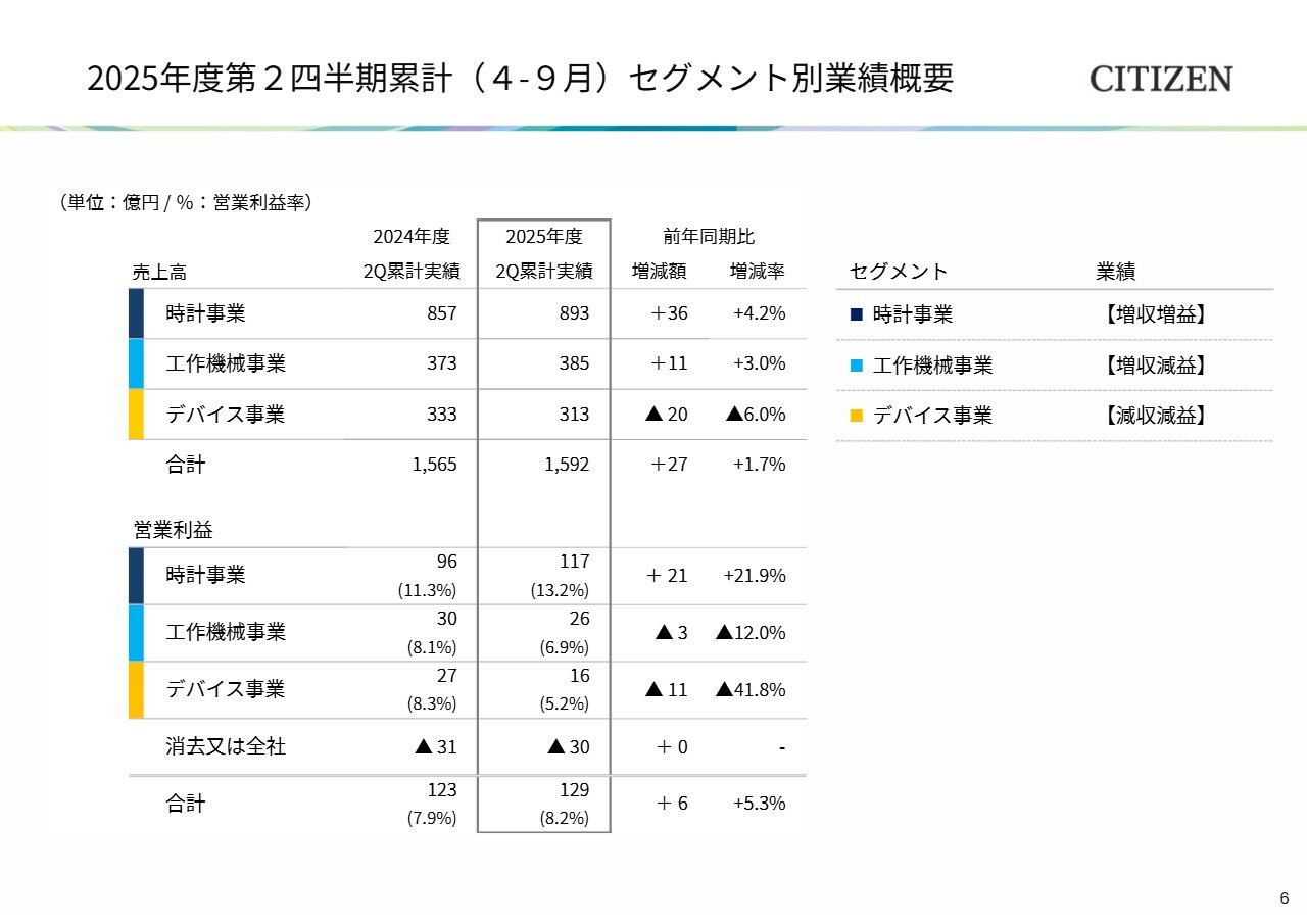 売上高は、時計事業と工作機械事業が堅調に推移したことにより1,592億円となり、前年同期比1.7パーセントの増収となりました。営業利益は主に時計事業の収益性改善が進んだことで129億円となり、前年同期比5.3パーセントの増益でした。営業利益率は8.2パーセントとなりました。