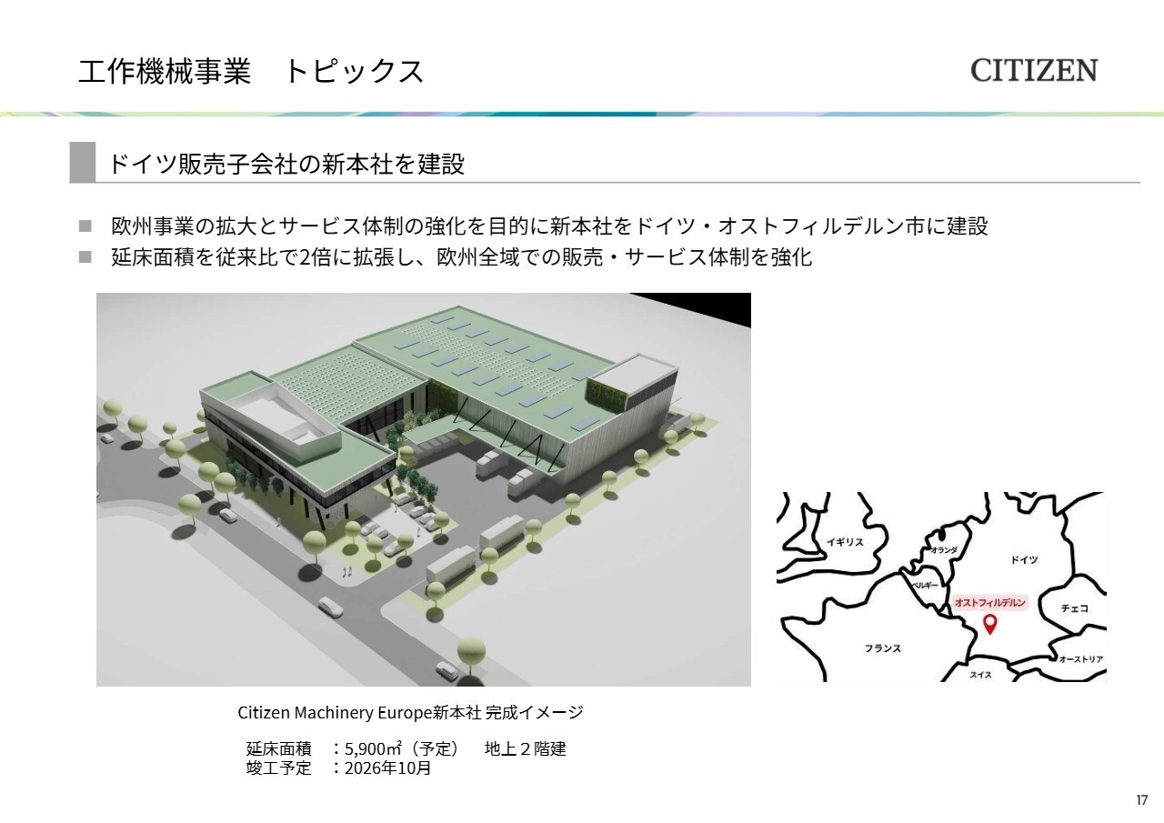 工作機械事業におけるトピックスです。欧州事業の拡大とサービス体制の強化を目的に、ドイツ販売子会社の新本社をドイツ・オストフィルデルン市に建設する予定です。