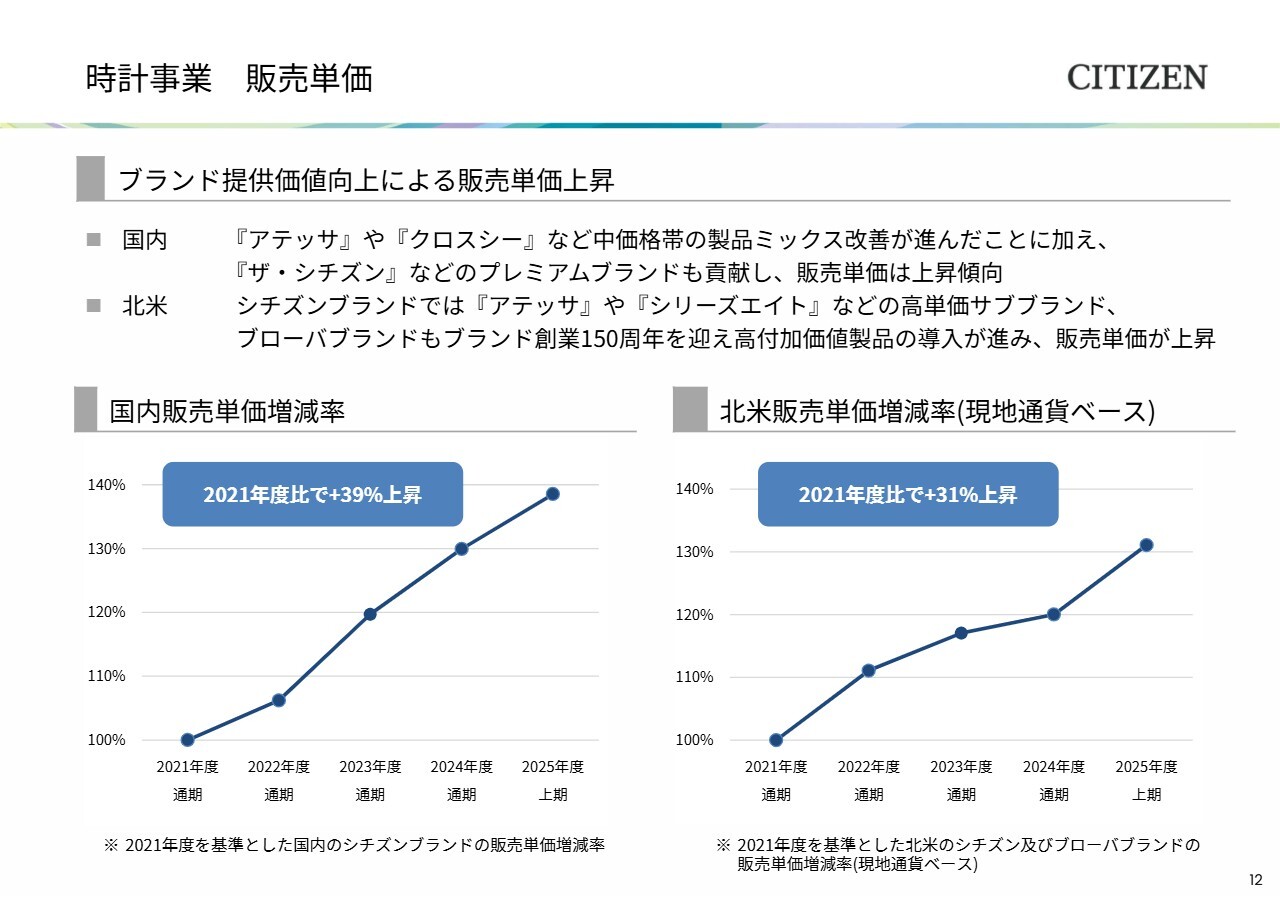 主要2地域の販売単価の推移についてご説明します。国内では「アテッサ」や「クロスシー」など、中価格帯の製品ミックス改善が進んだことに加え、「ザ・シチズン」などのプレミアムブランドも貢献し、販売単価は2021年度比で39パーセント上昇しました。