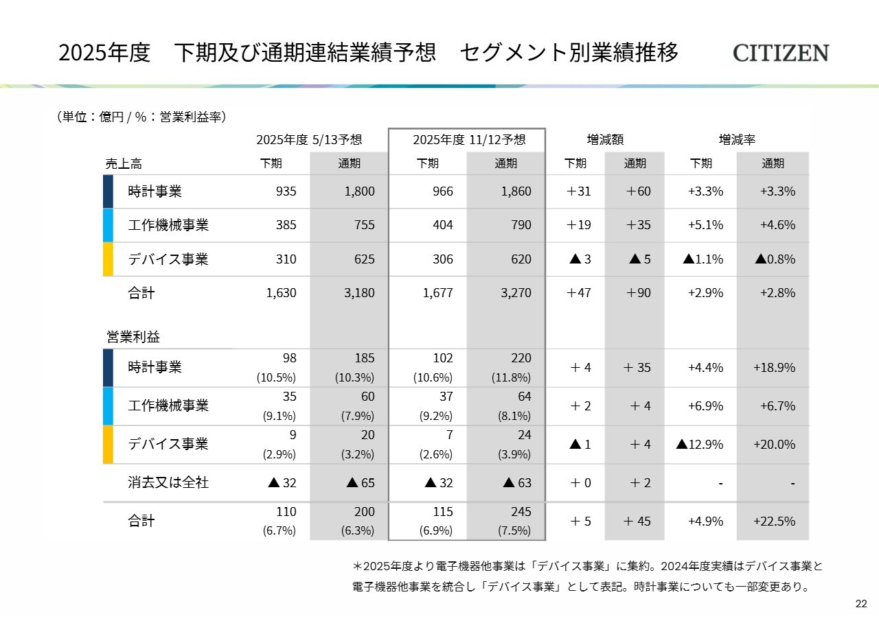 工作機械事業については受注が緩やかに回復しており、こちらも上方修正しています。デバイス事業については下期にやや減益となる見込みですが、上期の上振れにより通期では増益を計画しています。