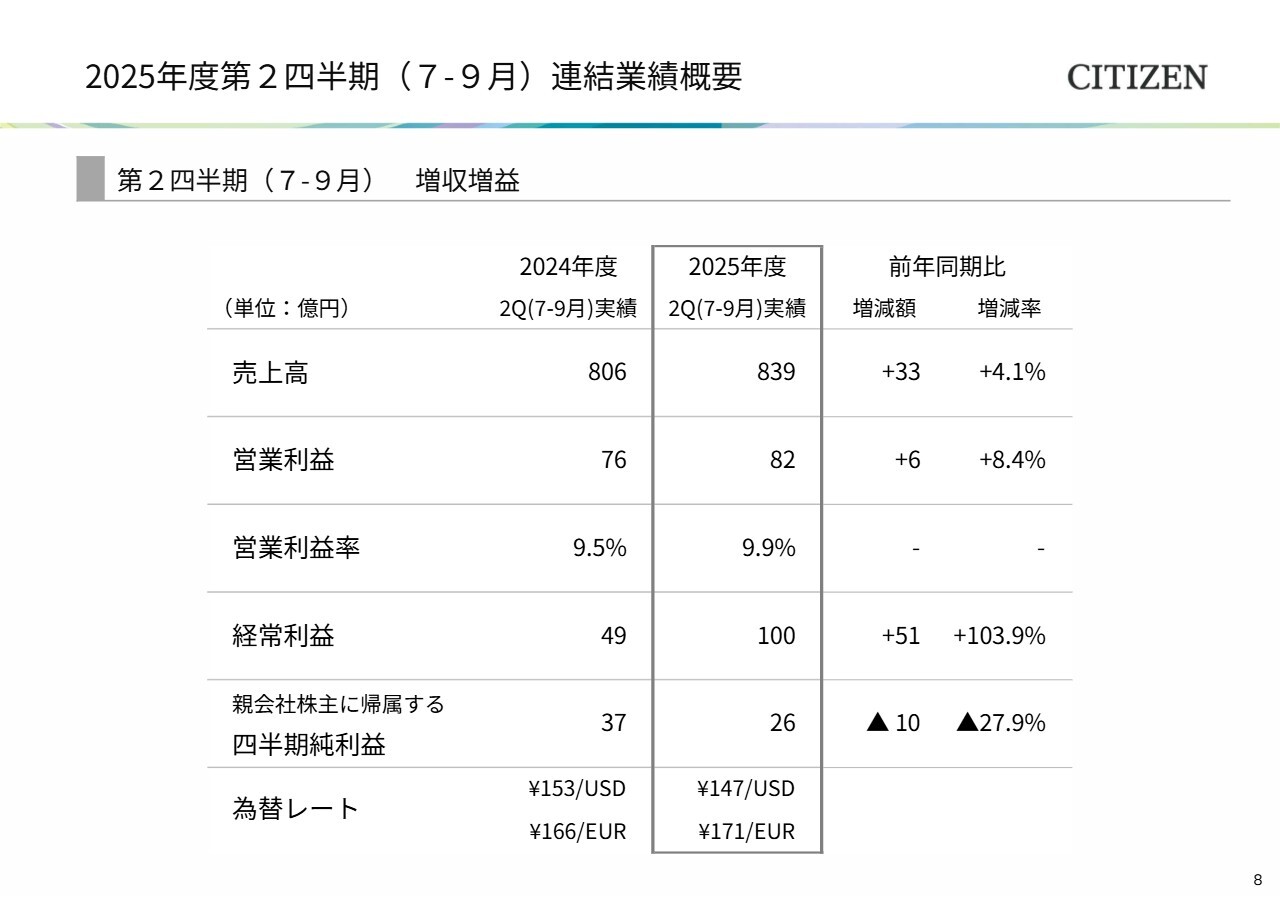 第2四半期3ヶ月間の連結業績についてご説明します。売上高は839億円で、前年同期比4.1パーセントの増収となりました。営業利益は82億円で、前年同期比8.4パーセントの増益となり、営業利益率は9.9パーセントとなりました。経常利益は為替差益の増加などにより100億円となり、前年同期比103.9パーセントの増加となりました。