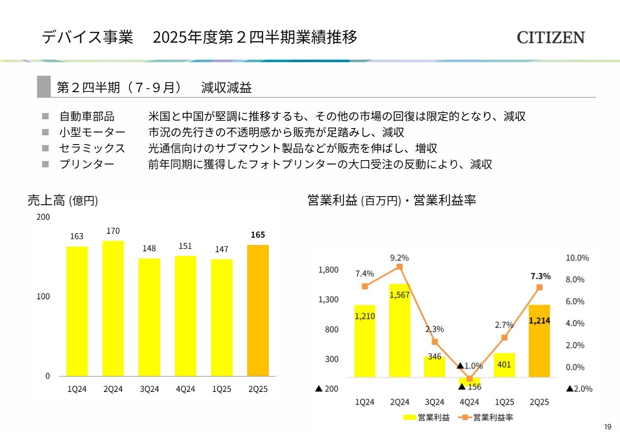 デバイス事業についてご説明します。売上高は165億円で、前年同期比2.6パーセントの減収、営業利益は約12億円で、前年同期比22.6パーセントの減益となりました。