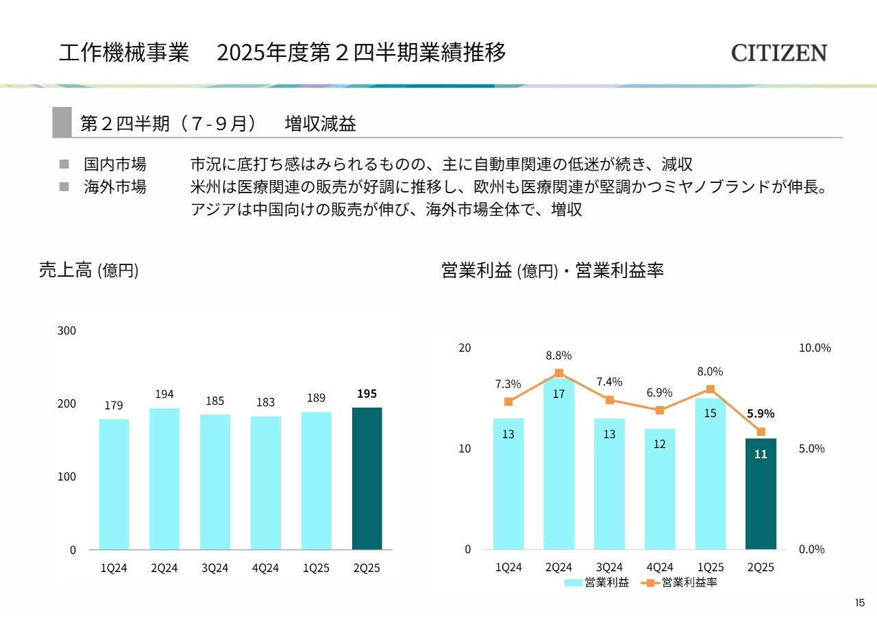 工作機械事業の売上高は195億円で、前年同期比0.3パーセントの増収、営業利益は11億円、前年同期比32.8パーセントの減益となりました。
