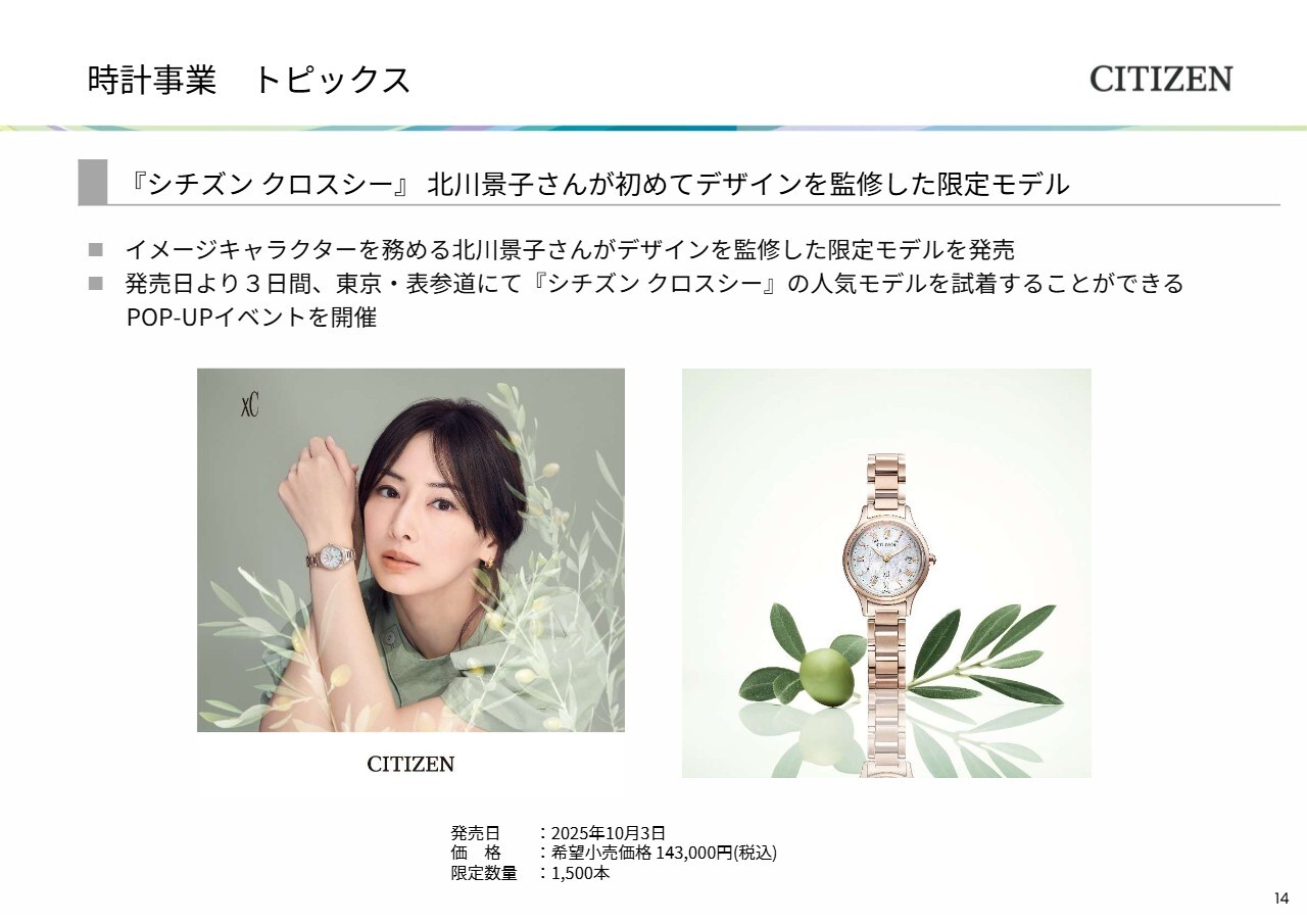 次に、レディスウォッチブランド「シチズン クロスシー」についてです。2012年にイメージキャラクターに就任し、長年「クロスシー」を愛用いただいている北川景子さんならではの視点で、初めてデザイン監修を行った特別な限定モデルを販売しました。