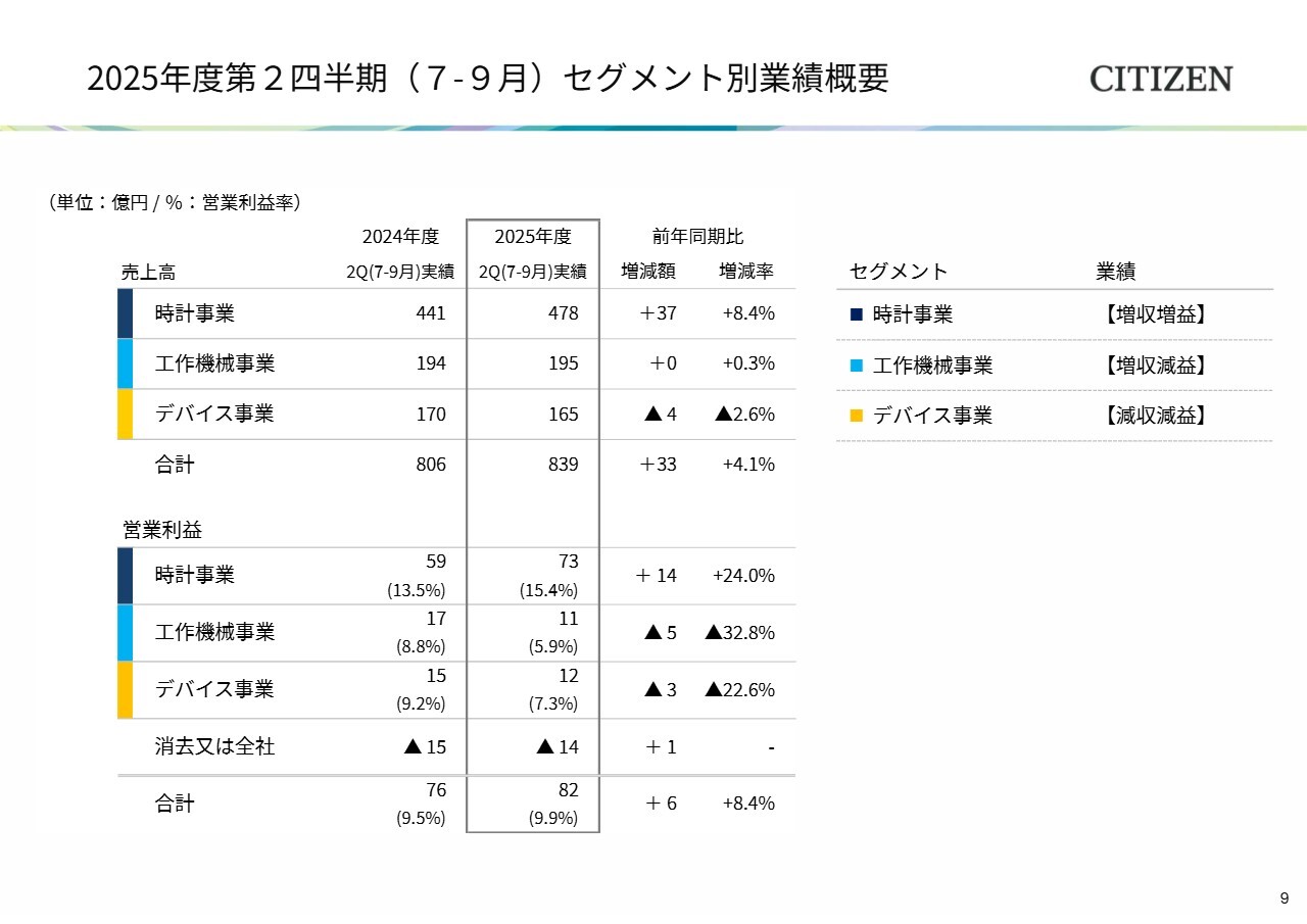 2025年度第2四半期(7-9月)セグメント別業績概要