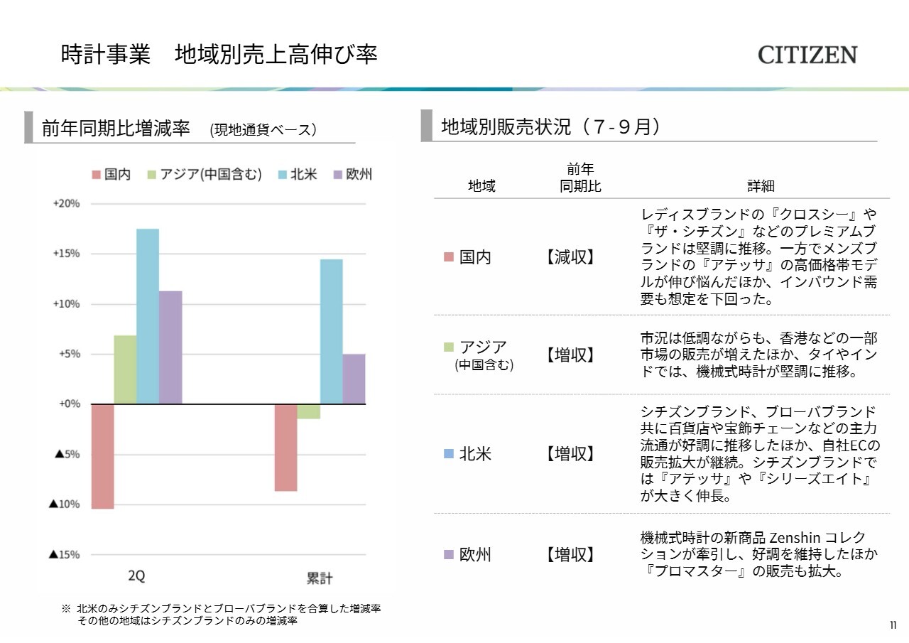 北米では、シチズンブランドやブローバブランドが時計専門店や百貨店向けの販売で好調を維持し、さらに自社ECの販売拡大が続き、増収となりました。また「シチズン」ブランドでは、本格投入を進めた「アテッサ」や機械式ブランドの「シリーズエイト」などが引き続き販売を伸ばしました。