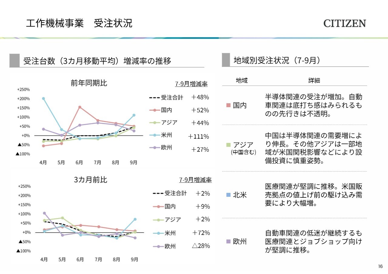 アジアは第2四半期に中国で想定以上の受注をとることができました。北米は10月からの値上げを受け9月に駆け込み需要が入りましたが、値上げ後の10月は上期平均よりも高い水準の受注を獲得できています。欧州はジョブショップと医療関連が堅調です。