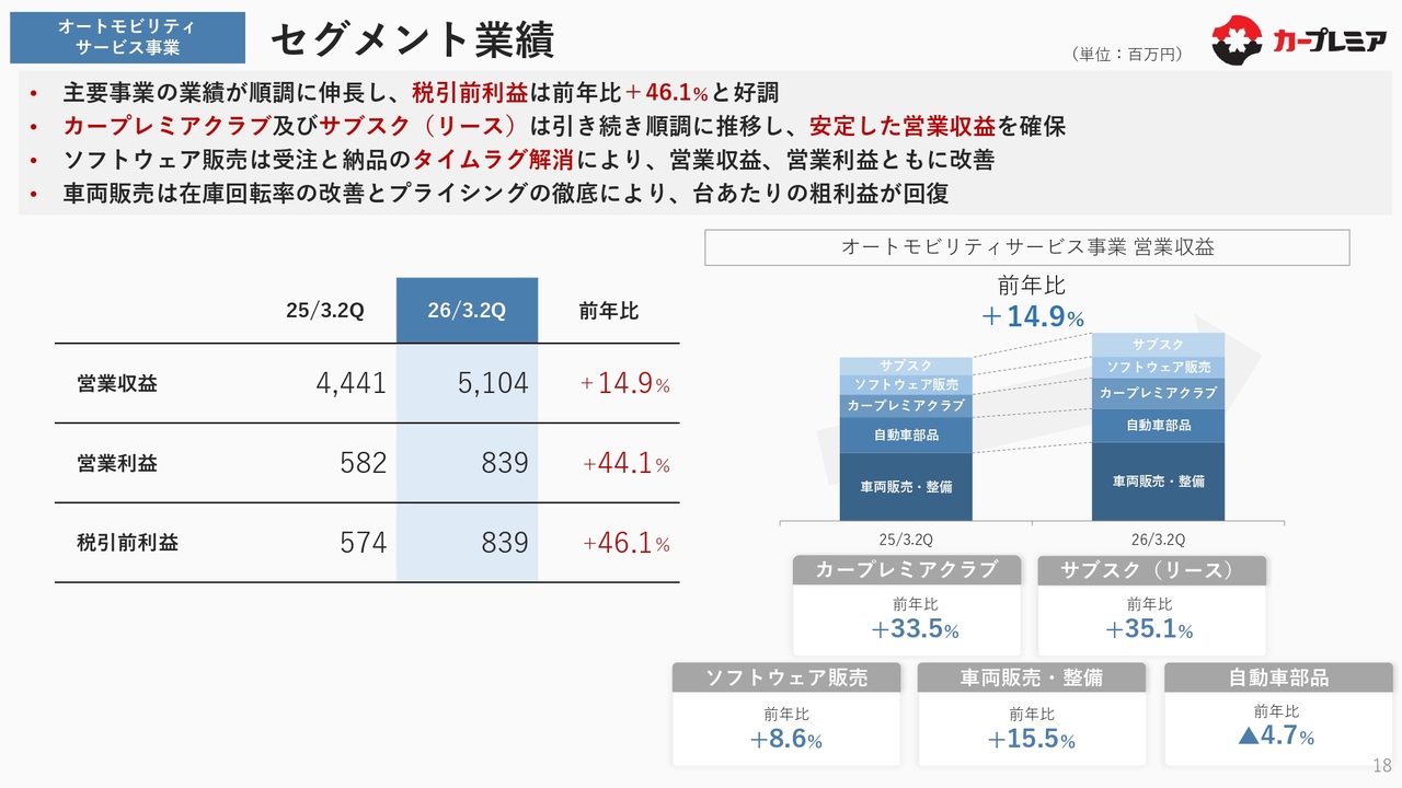 「カープレミアクラブ」の増加やサブスクリプション事業の継続的な好調推移により、安定した営業収益を確保できています。ソフトウェア販売については、受注と納品のタイミングのタイムラグが発生したことで若干のマイナスが生じていましたが、このタイムラグが解消され、収益および利益がともに改善しています。