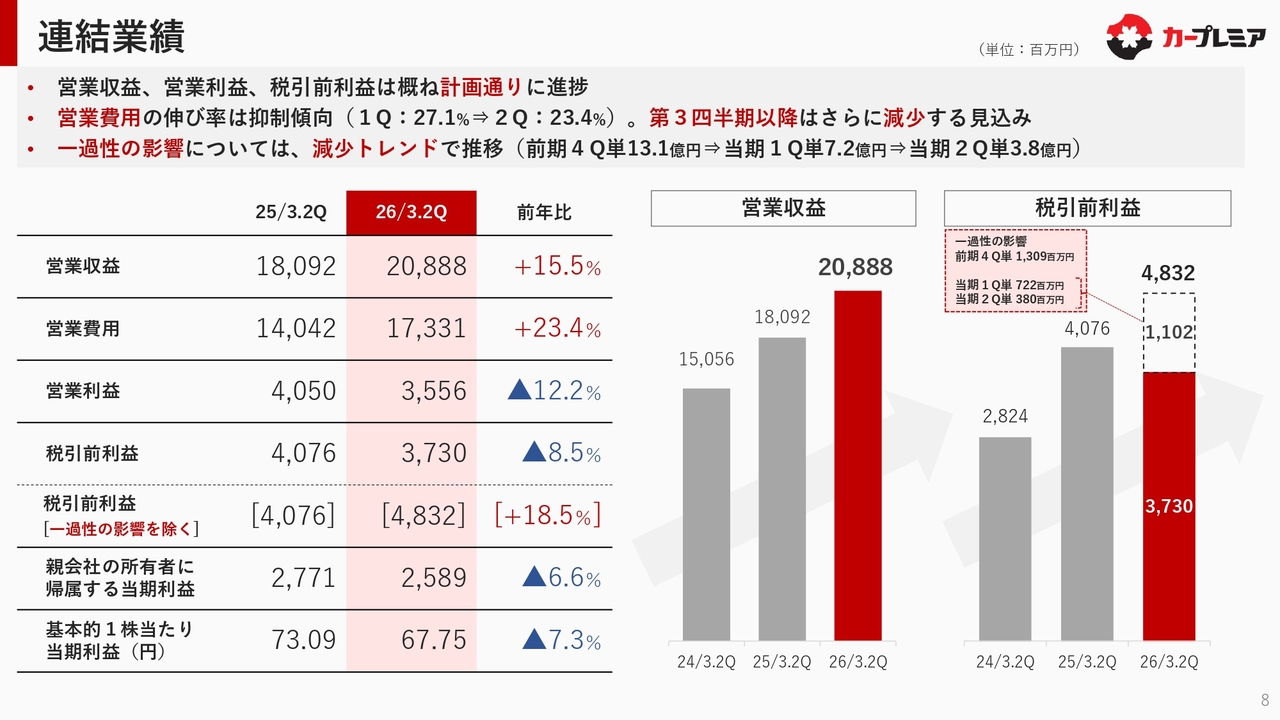 スライドに記載のとおり、今回のシステムの一過性の影響は約11億円となっています。これを除くと、営業収益とほぼ同じ伸び率で営業利益が推移しています。税引前利益についても前年比18.5パーセント増の成長を維持しており、しっかりと成長トレンドを描けていると考えています。