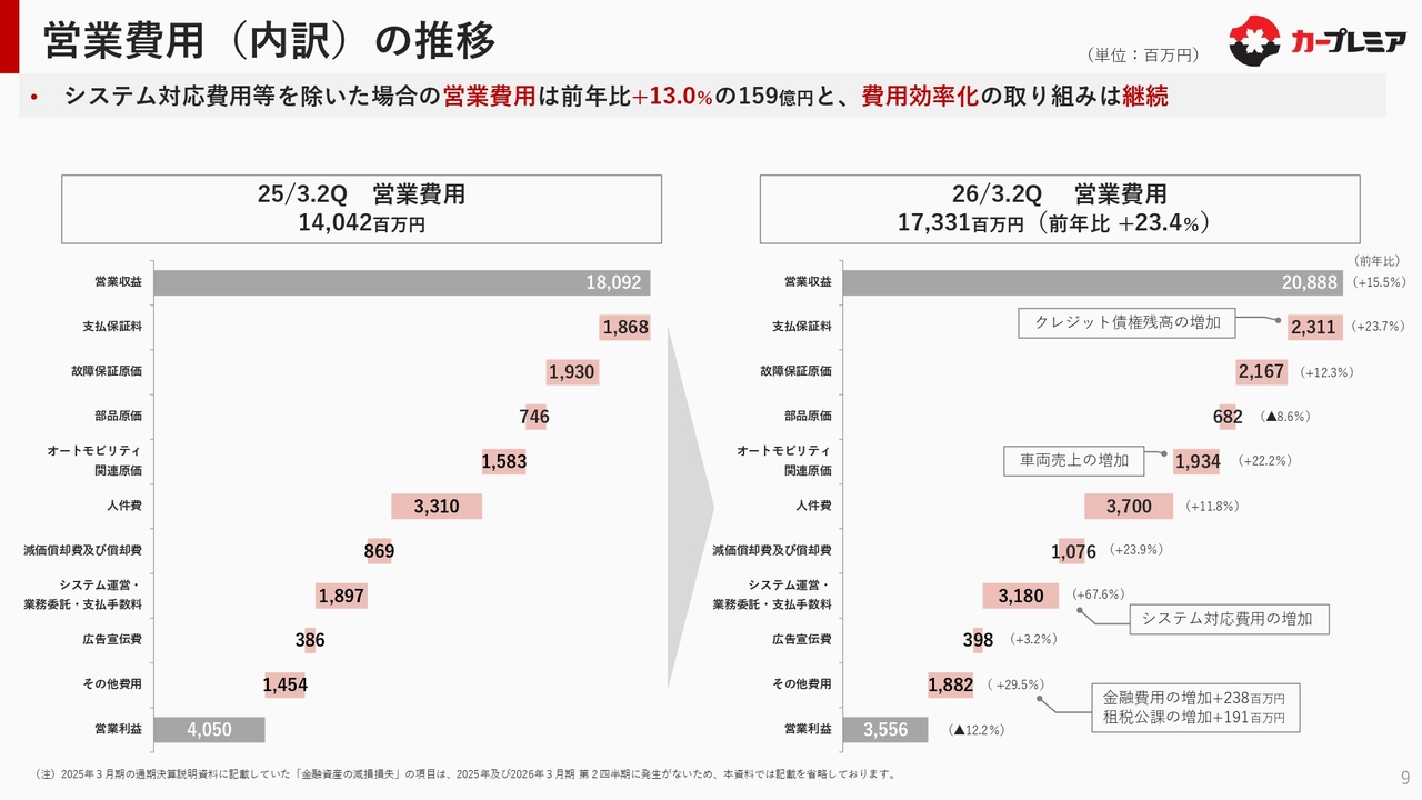 営業費用の内訳の推移についてです。それぞれの項目で残高の増加に伴う費用の増加がありますが、特に大きな要因は、今回のシステム対応費用が一過性の大きな負担となっていることです。