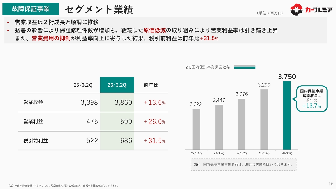 故障保証事業の営業収益は前年比13.6パーセント増加し、継続的な原価低減の取り組みにより営業利益率も引き続き上昇しました。また、営業費用の抑制が利益率向上に寄与した結果、税引前利益は前年比31.5パーセント増と30パーセント以上の伸びを記録しました。