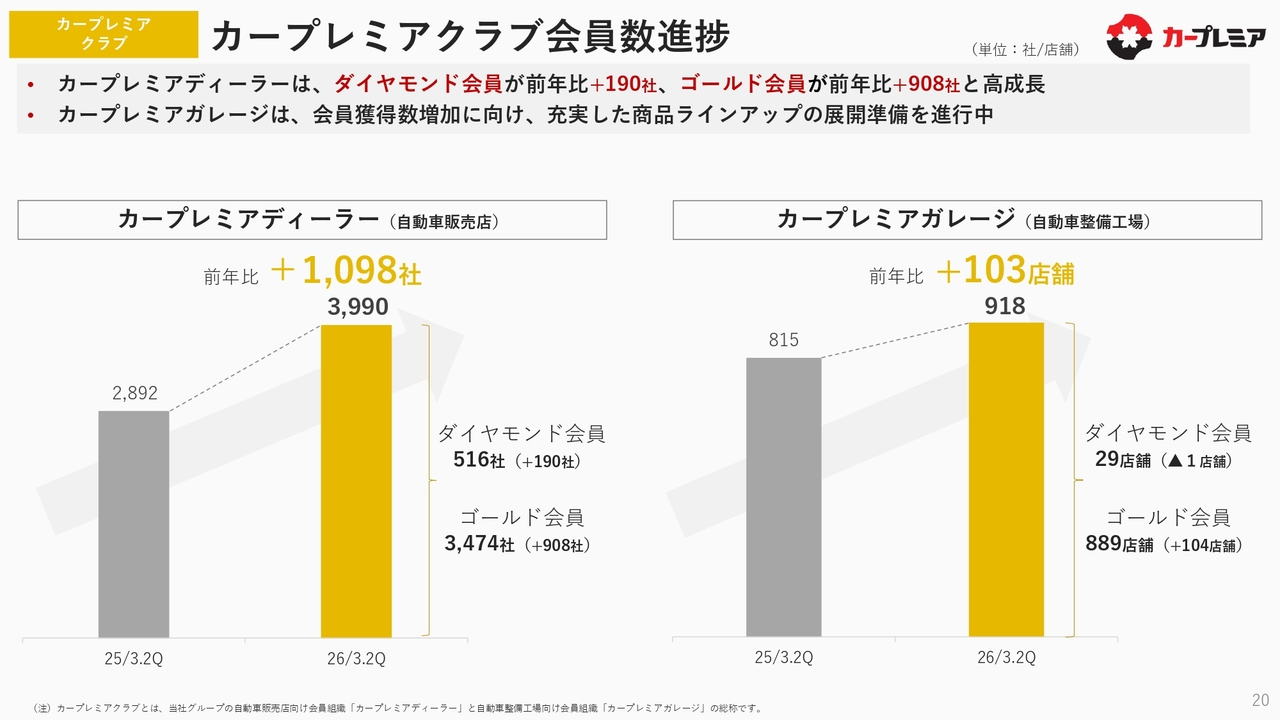 「カープレミアクラブ」の会員数の進捗についてです。「カープレミアディーラー」のダイヤモンド会員は前年比で約200社増加し、ゴールド会員についても前年比で908社増加するという高成長を遂げています。これによって合計で前期比約1,000社以上の増加となり、現在ではディーラー数は約4,000社に達しています。