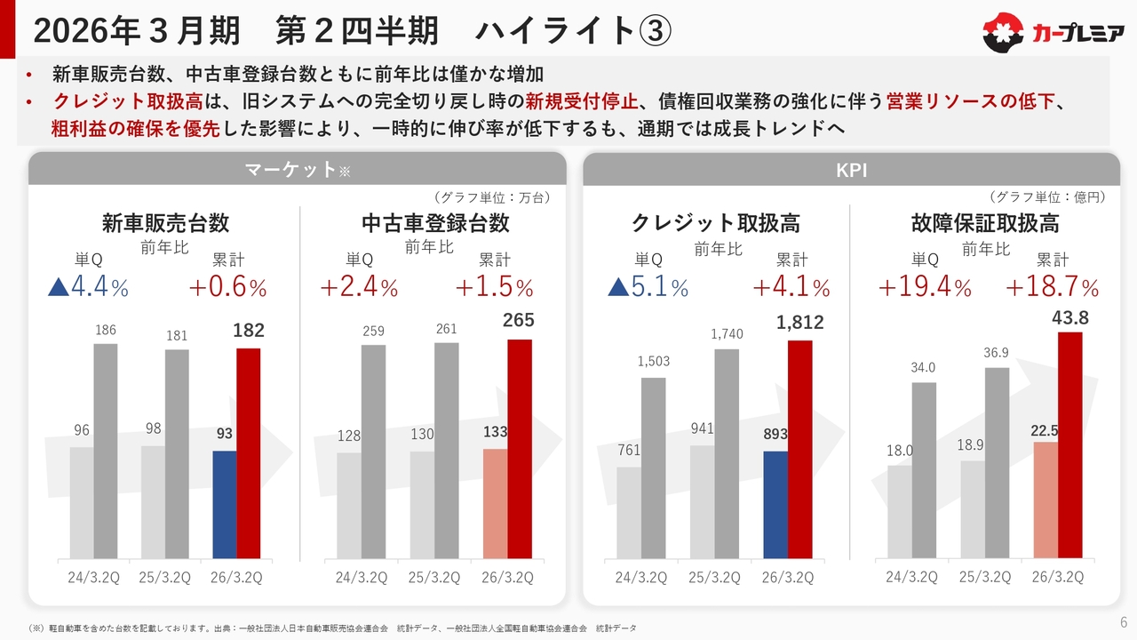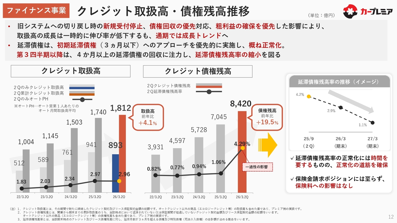 また通期では、クレジット取扱高については成長トレンドに戻すことを目指しています。一方、故障保証取扱高は前年比で約20パーセント増と好調であり、故障保証事業は順調に推移していると考えています。