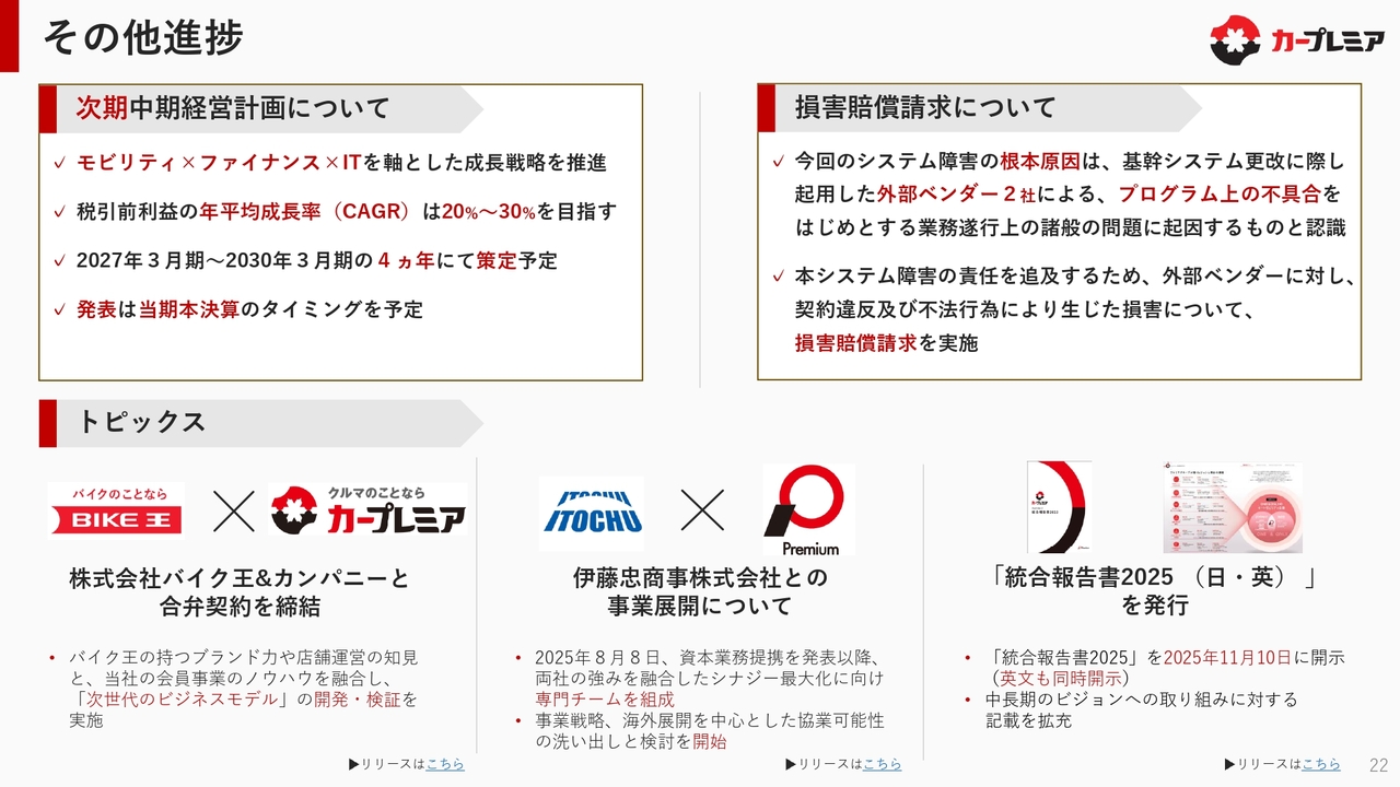 続いて、第2四半期のトピックスです。1つ目は、本日リリースしたとおり、バイクで非常に高いブランド力を持つ株式会社バイク王&カンパニーと合弁契約を締結しました。今後は、同社と共同で二輪および四輪の店舗展開を進めるとともに、当社が持つ「カープレミアクラブ」の会員事業のノウハウを融合させた、次世代のビジネスモデルになるような商品やサービスの提供について、両社で開発・検証を実施していきたいと考えています。