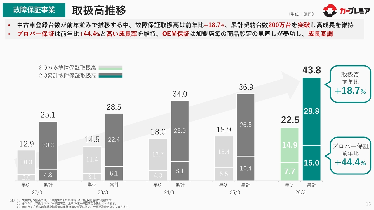 故障保証事業についてご説明します。中古車の登録台数が前年並みに推移する中、故障保証取扱高は全体で前年比18.7パーセント増と、非常に高い伸び率で終えることができました。累計契約台数も200万台を突破しています。