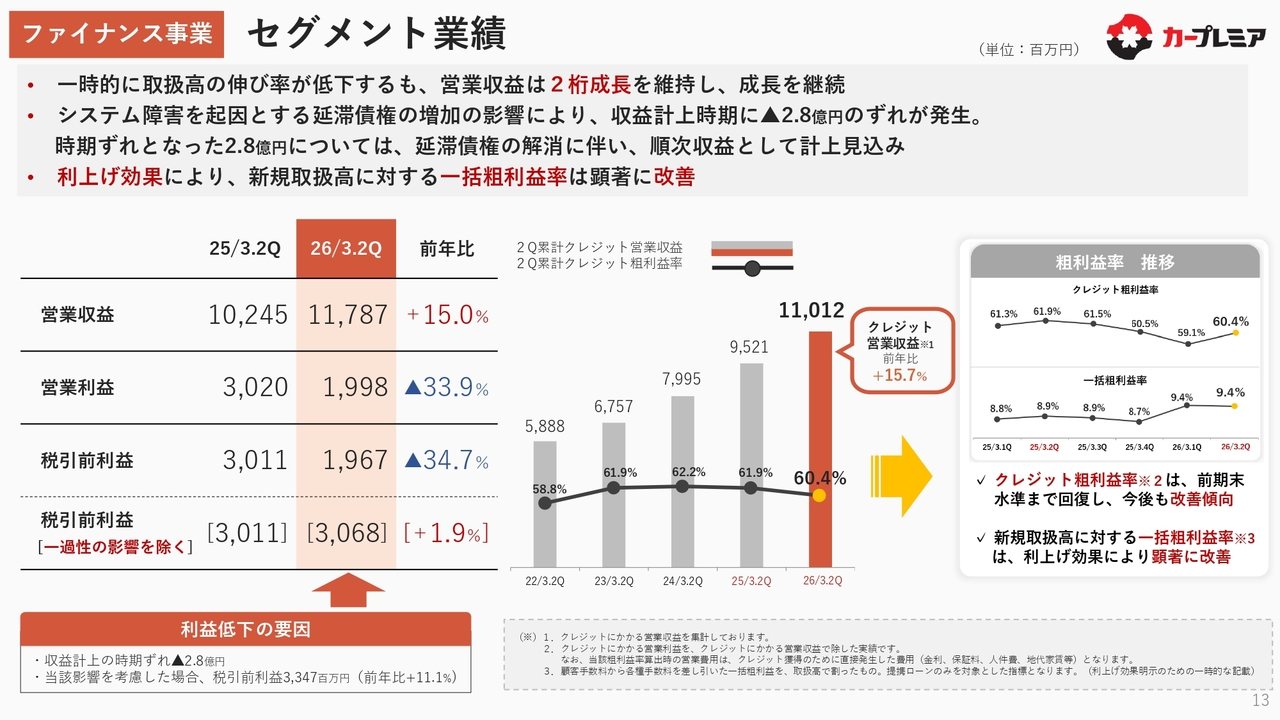 一方、クレジットの新規取扱高は前年比プラス4.1パーセントと低い伸びとなりました。これは、第2四半期に旧システムへの完全な切り戻しを実行したことにより、一定期間、新規受付を停止した影響です。