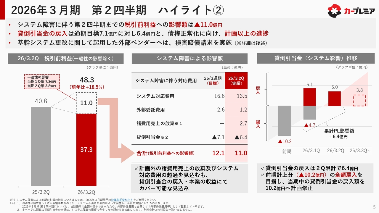 システム障害の影響額についてご説明します。期初に発表したシステム障害による税引前利益の影響額は、第2四半期累計でマイナスの約11億円となっています。