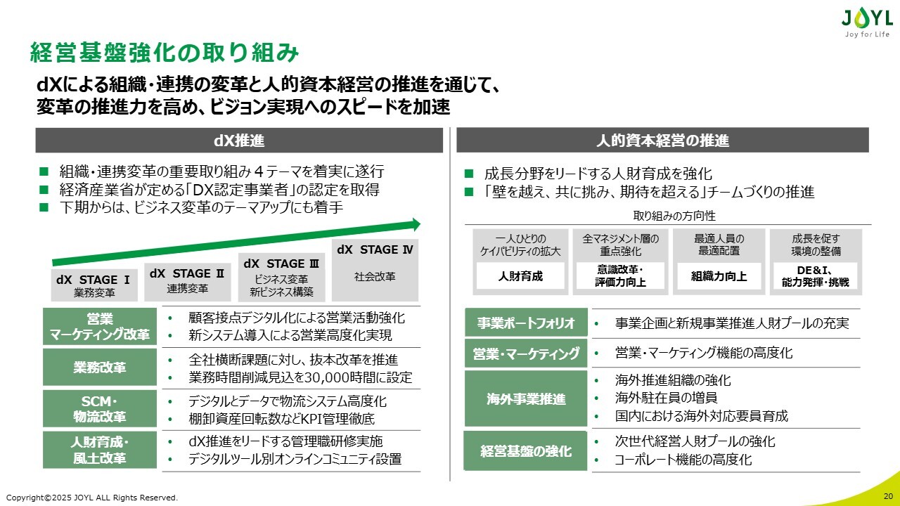 dXについては、昨年設定した4つの改革テーマが順調に進捗しています。例えば、年間3万時間の業務時間削減を目指す全社横断的な課題に対して、各部門で抜本的な業務改革が進められています。これらの業務改革および連携変革の取り組みを通じて、ビジネス変革のテーマが発案され、新たな取り組みにも着手していきます。