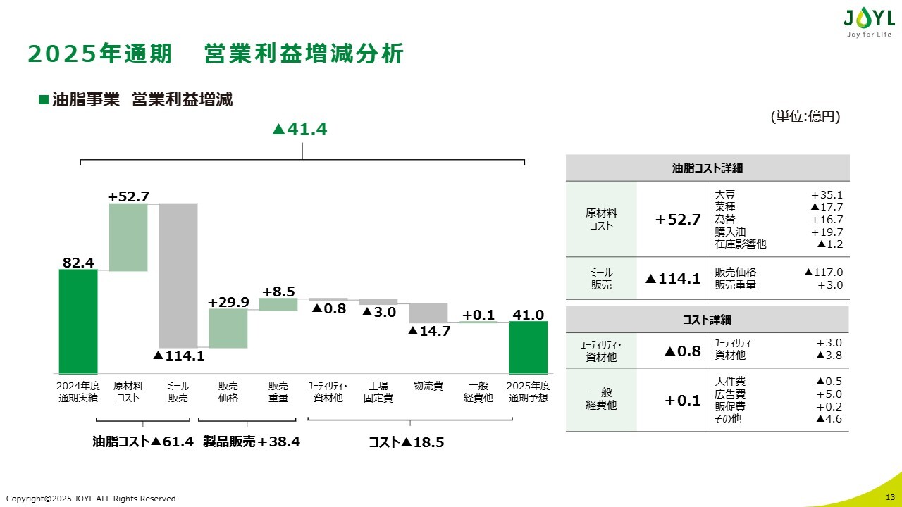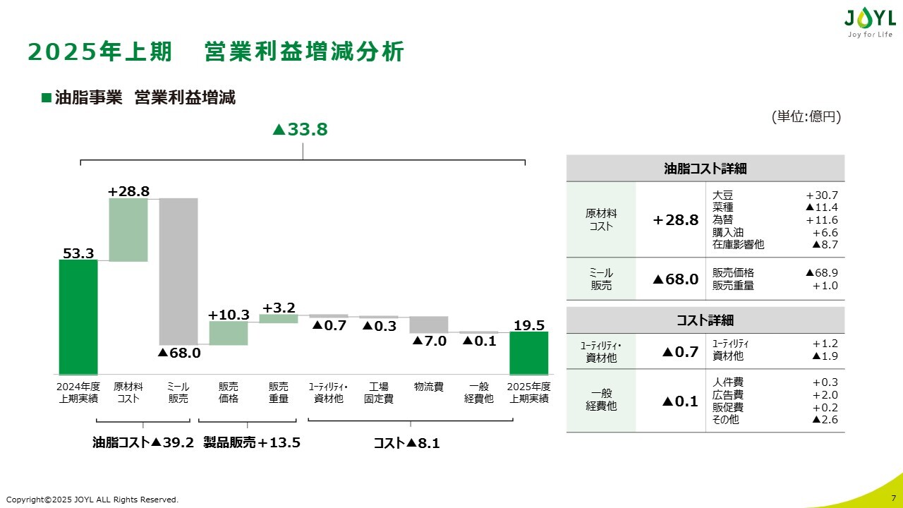 一方、ミール価格の大幅な下落により、ミール販売を含む油脂コスト全体では前年同期比で39億2,000万円の減益要因となっています。