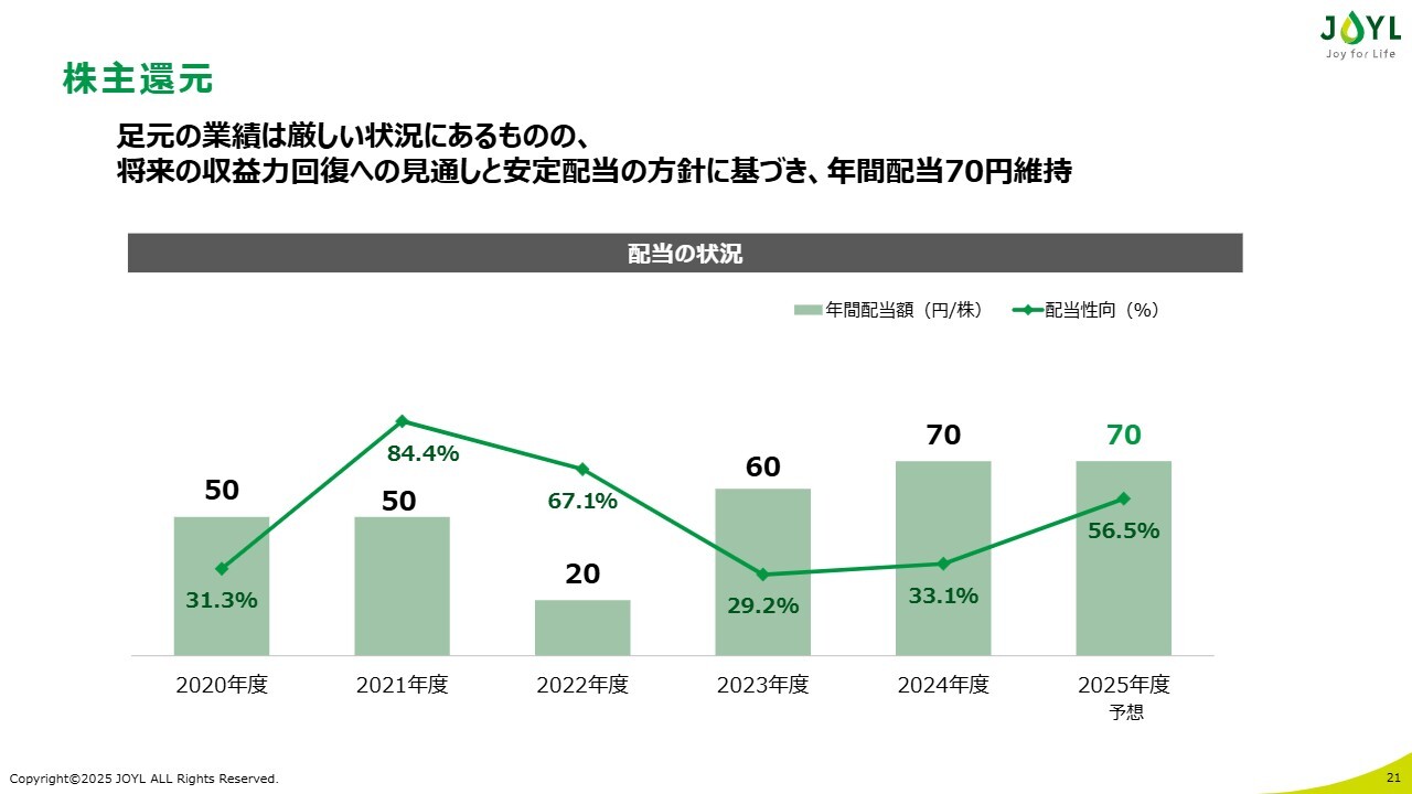 最後に、株主還元についてご説明します。2025年度の1株当たり配当は、70円から変更ございません。
